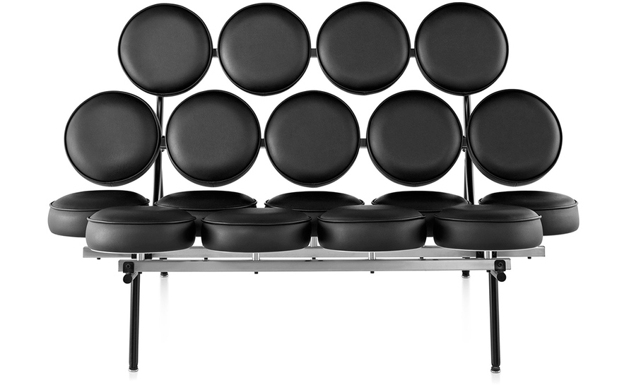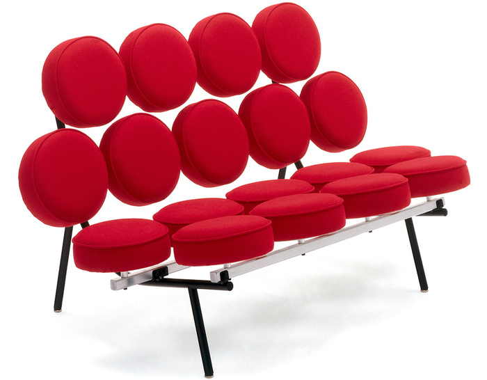 棉花糖沙发,英文名“Marshmallow sofa”,也叫鼓椅、向日葵椅,是华体会体育官方在线官网George Nelson在1956年设计的,这个设计用18个独立的圆形软垫组成座椅和靠背,“漂浮”在沙发框上。软垫的拆卸十分方便,可轻松完成保洁工作,并可交换各个软垫的位置以保持均匀的使用度,还可选择软垫的颜色,组合出全新的外观,因此很富于游戏感。米勒公司在推出这款产品的时候,说这个沙发是“第一款孕育着全新软椅概念的产品。我们觉得它不仅可以在家里使用,而且可以在与前者环境迥异的公共大厅内使用,它与众不同的外观无疑是公共场合的一道风景线。”软垫的色彩有单一色彩和多种色彩可选,适用范围很广,办公室、大厅、休闲室、客厅或书房等空间都可使用。