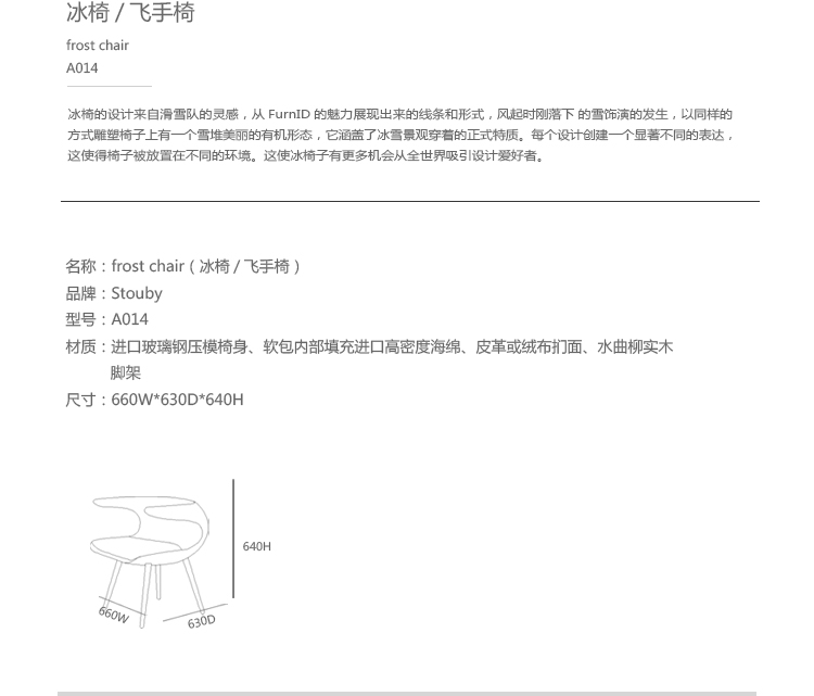 冰椅由来自丹麦哥本哈根的设计工作室FurnID的博·斯爵奇( Bo Strange )与工业华体会体育官方在线官网莫滕·克亚尔·斯达乌戈德(Morten Kjær Stovegaard)二人设计。 冰椅材质:优质玻璃钢椅身,外表是高级羊绒布料或意大利进口真皮;水曲柳实木脚(新改进)。这样的搭配让椅子重现经典的外观和未来的样子。