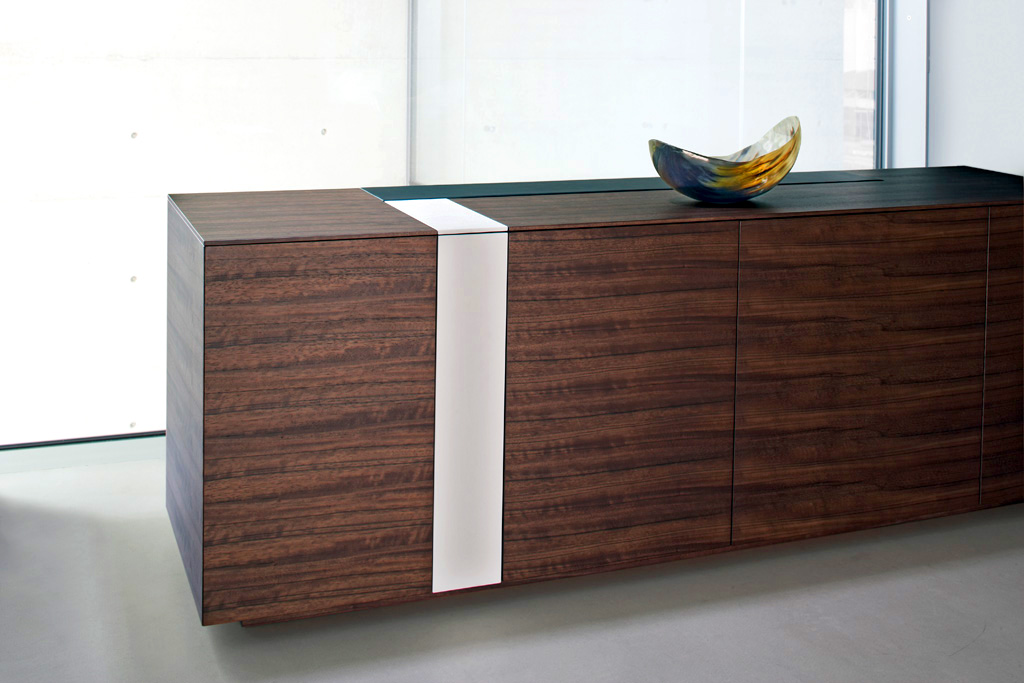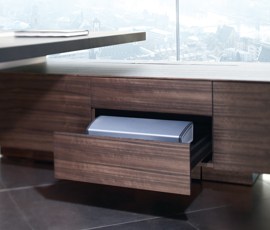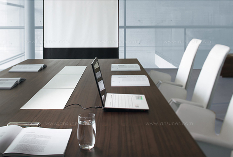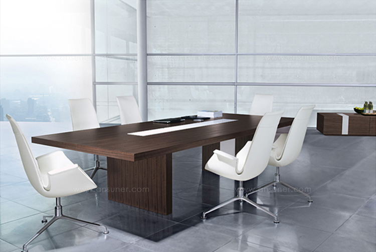 这是EOOS的新总部和会议项目设计团队对该产品强大的美学诉求,这个模型散发着成熟和信任的风格。无论是作为一个单独的会议桌,还是作为一个单独设计的大型会议系统,架构总是保持其清晰性。昂贵的材料创造了一种即时的视觉印象:海洋胡桃木单板和Corian。白色区域隐藏着集成线盒,衔接到各种能源和设备。