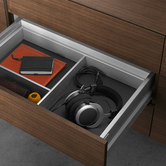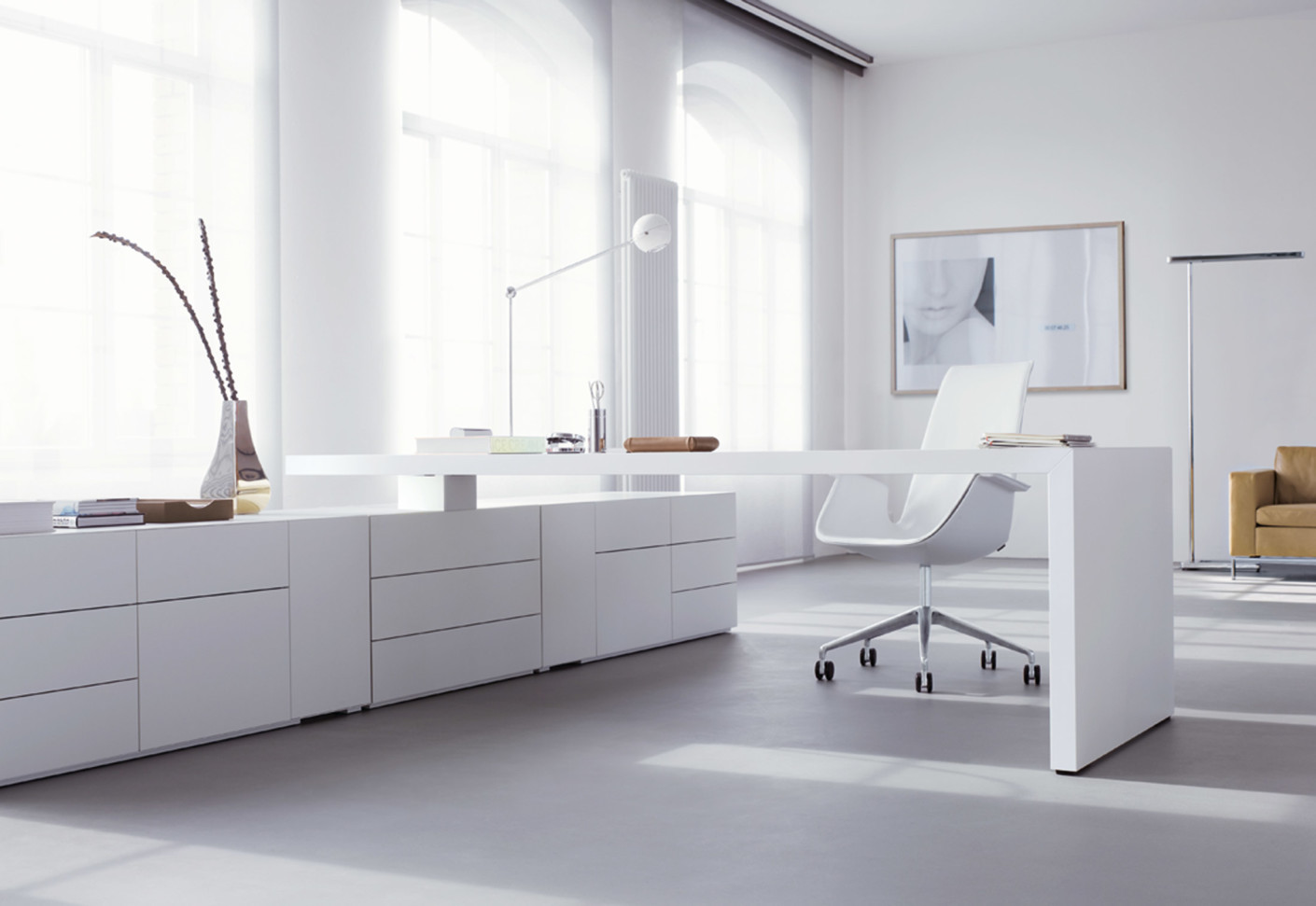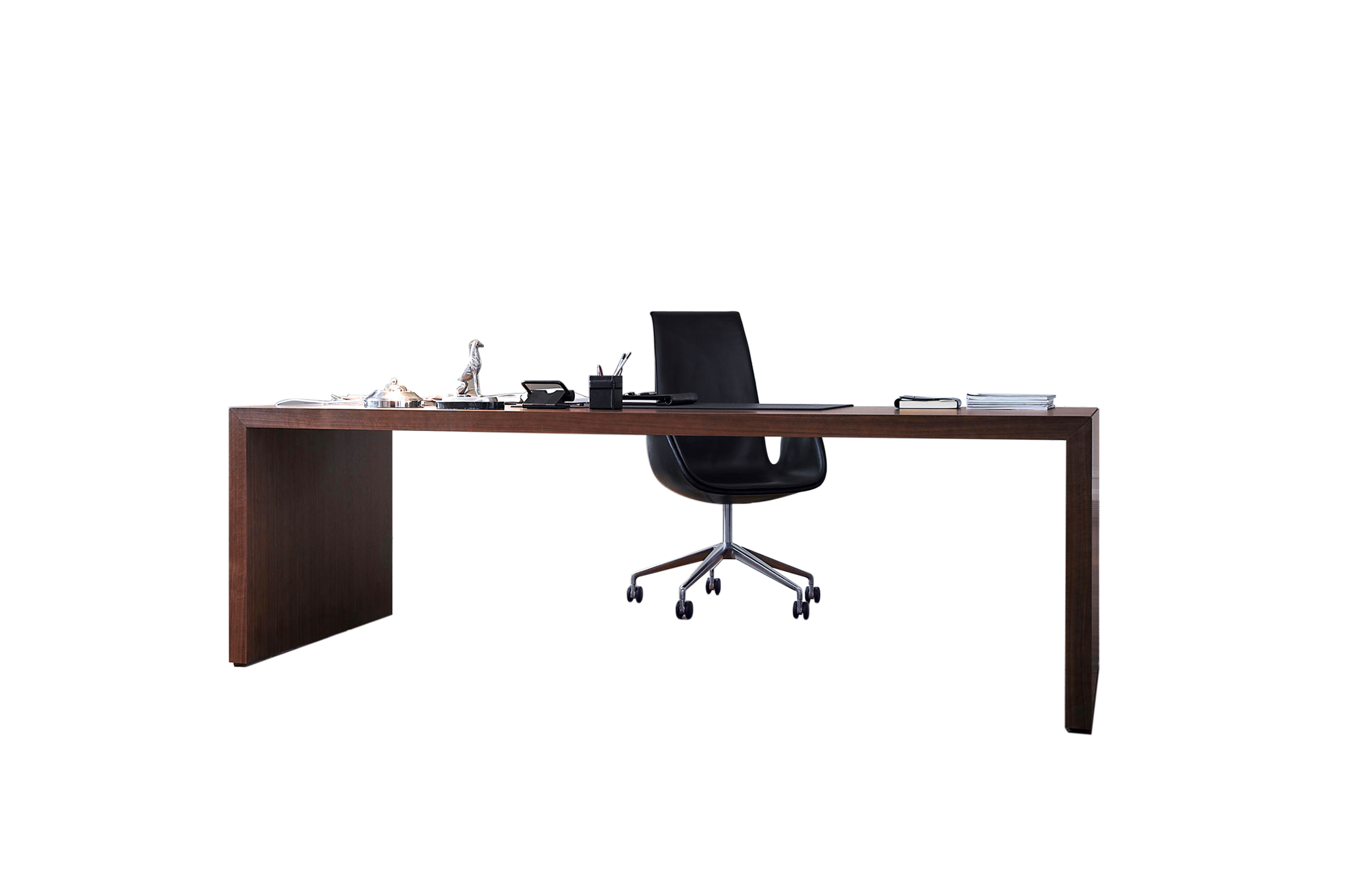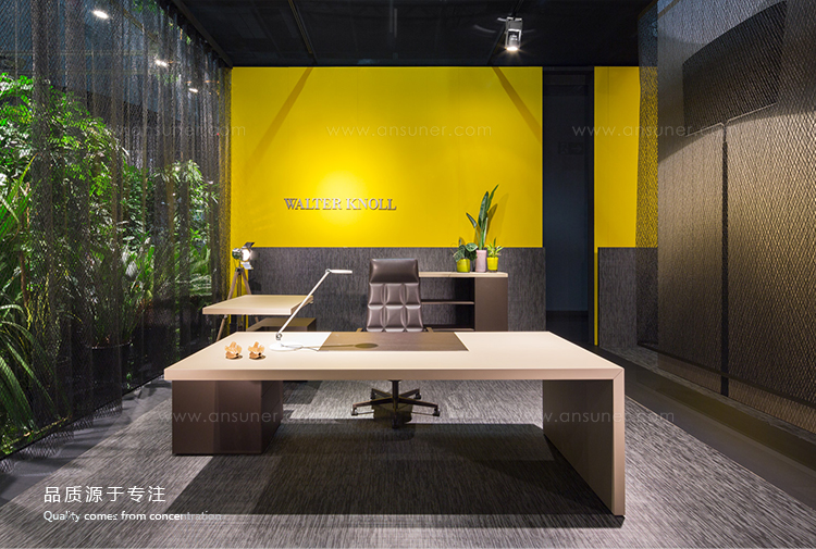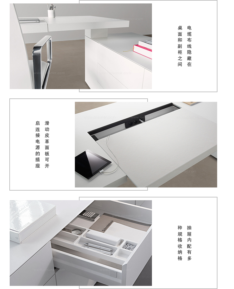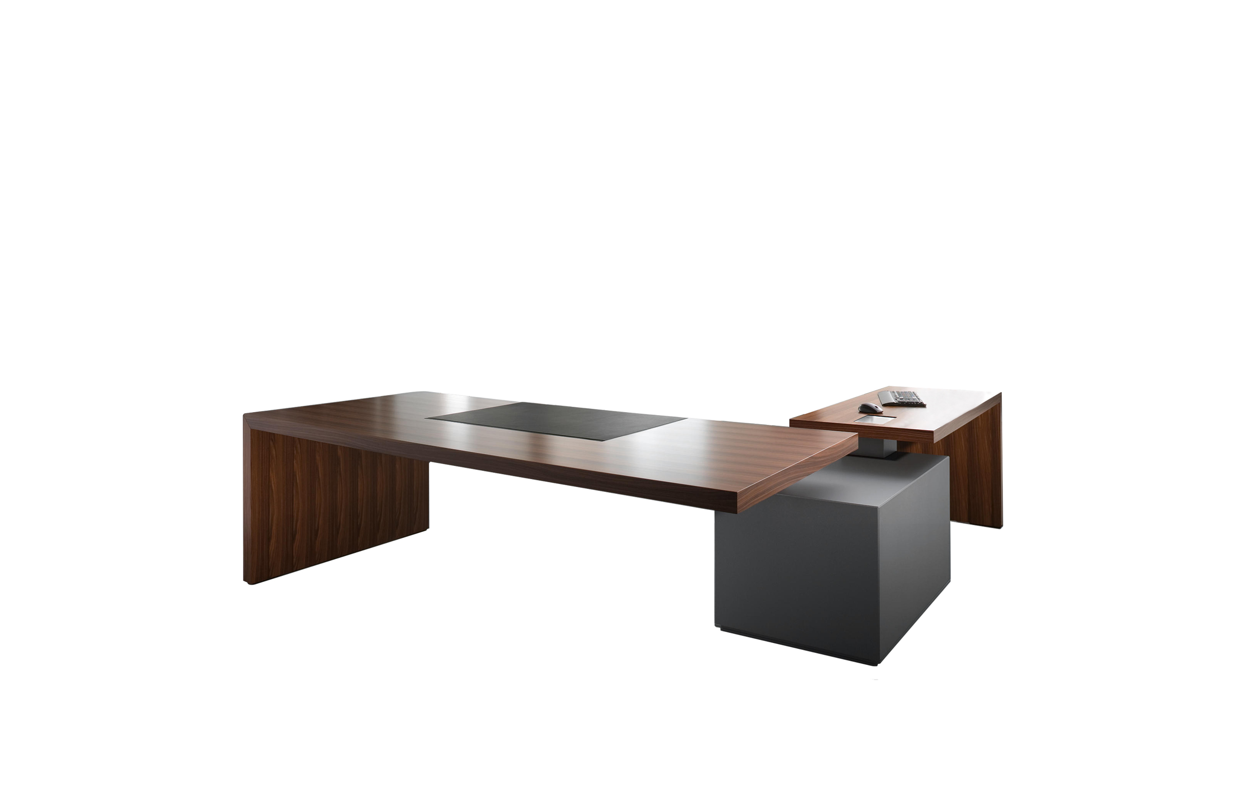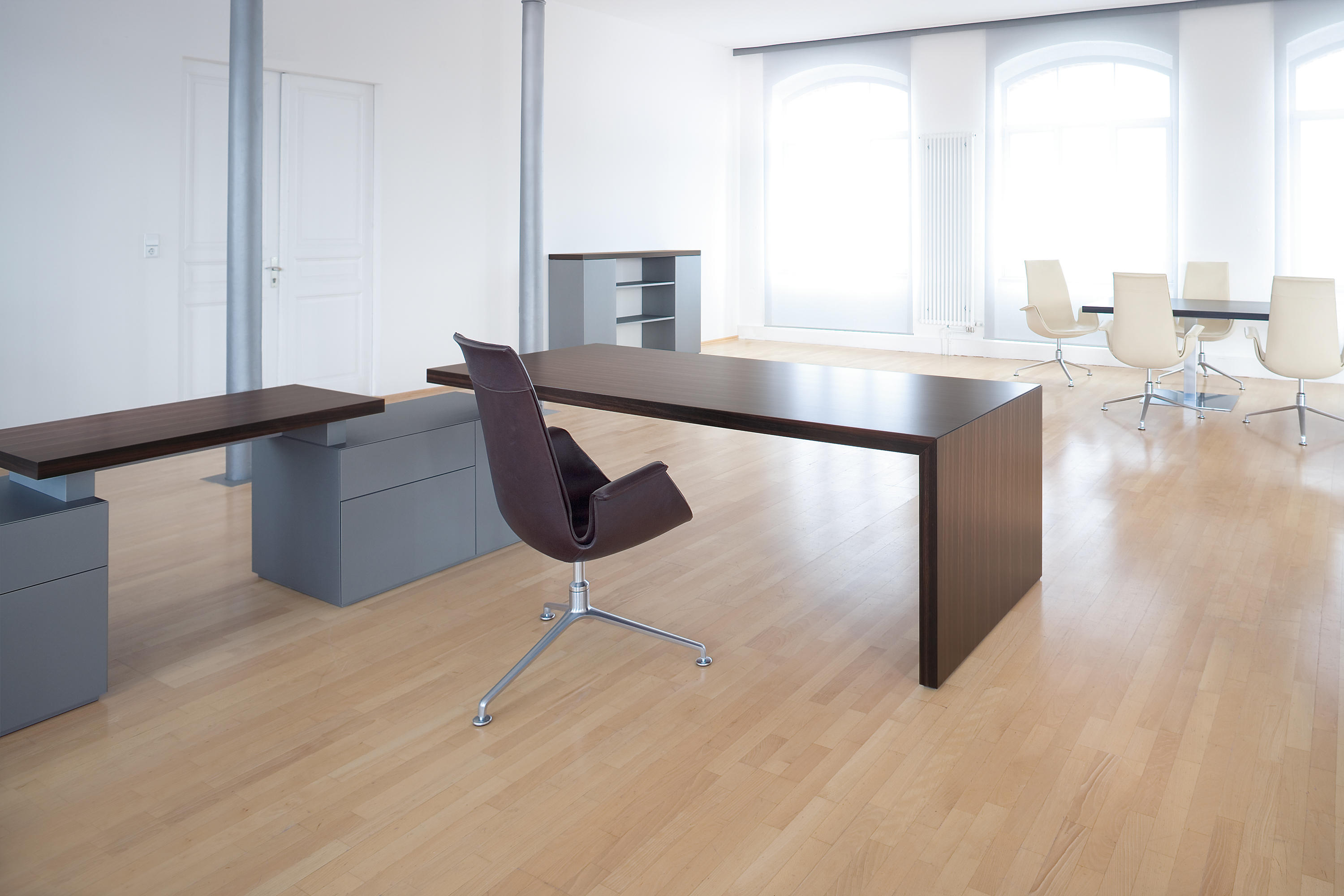桌面和侧面,水平和垂直形成一个均匀的结构,是Headoffice Mono系列会议项目设计团队所执行的结构概念。强大的线条与精选材料的优雅相结合。由侧面和桌面所制成的直角,中间的桌子上有醒目皮革包裹的面板,如果有需要,可以使用滑动皮板来打开集成线路。电缆布线隐藏在桌面和副柜之间。