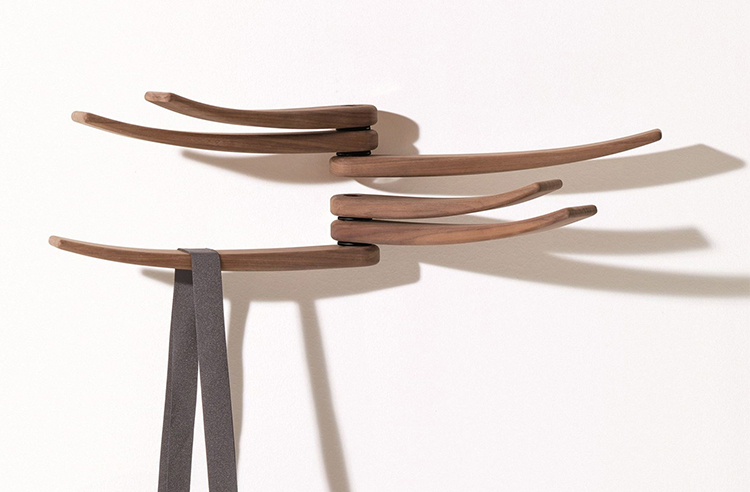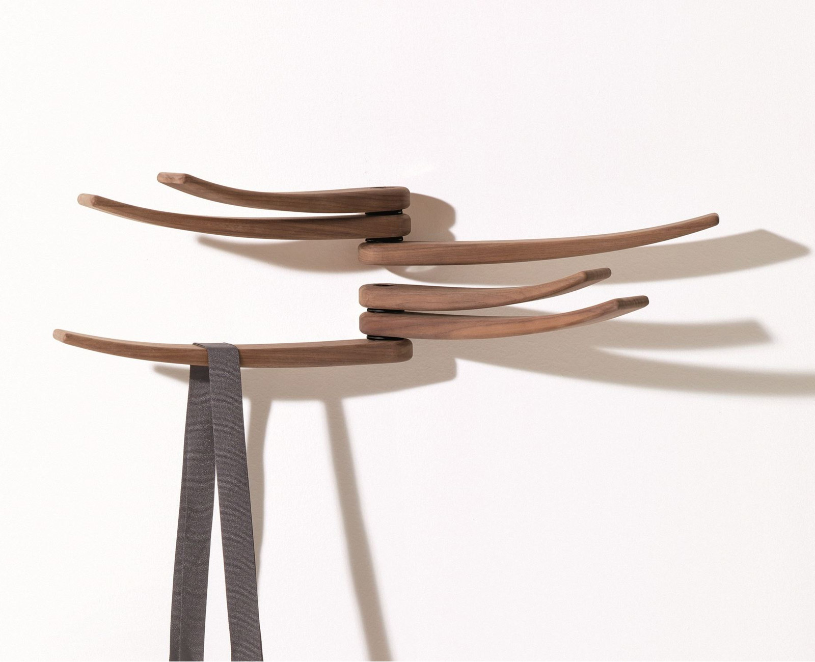 Wing是一个壁挂式衣架,其动画墙壁的流动和轻柔条纹臂的运动扭曲和转动,创造出雕塑般的构图。 它一起或单独投射出一种柔软,起伏的形状,通过使用进一步动画,是任何空间的完美补充。