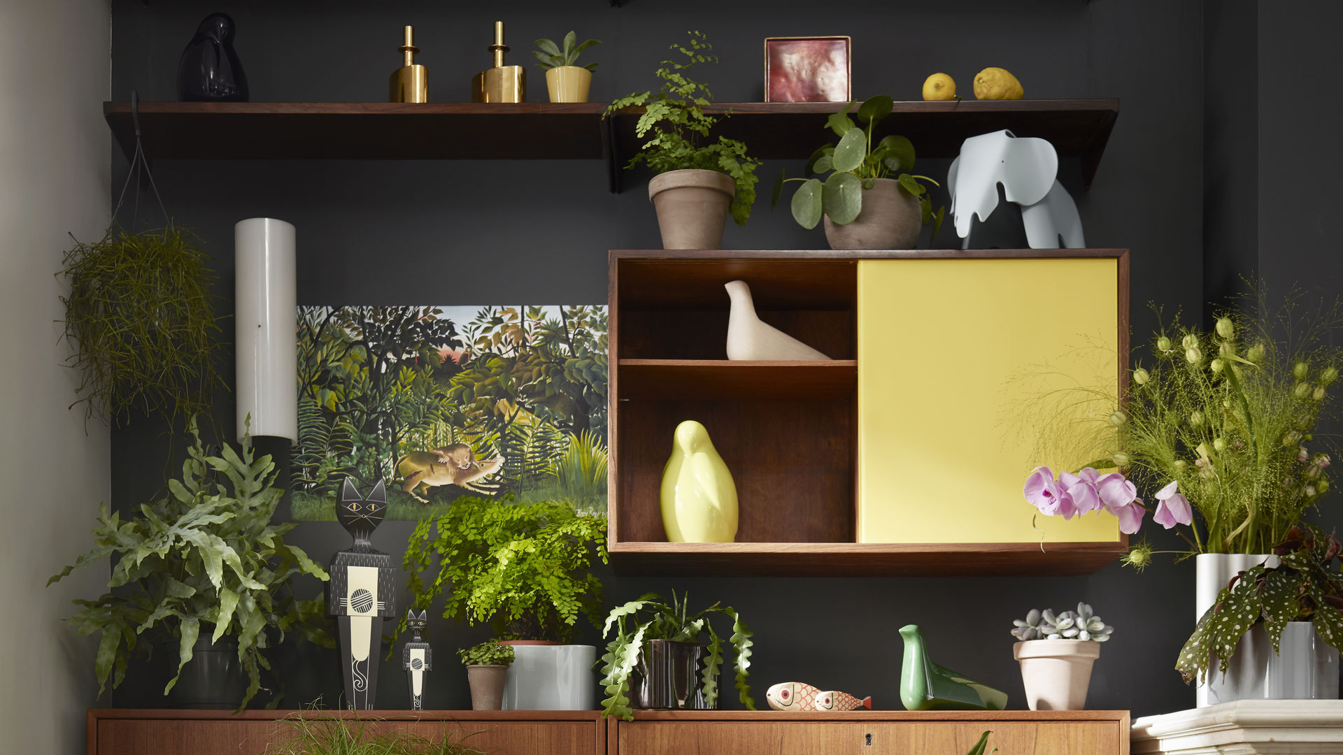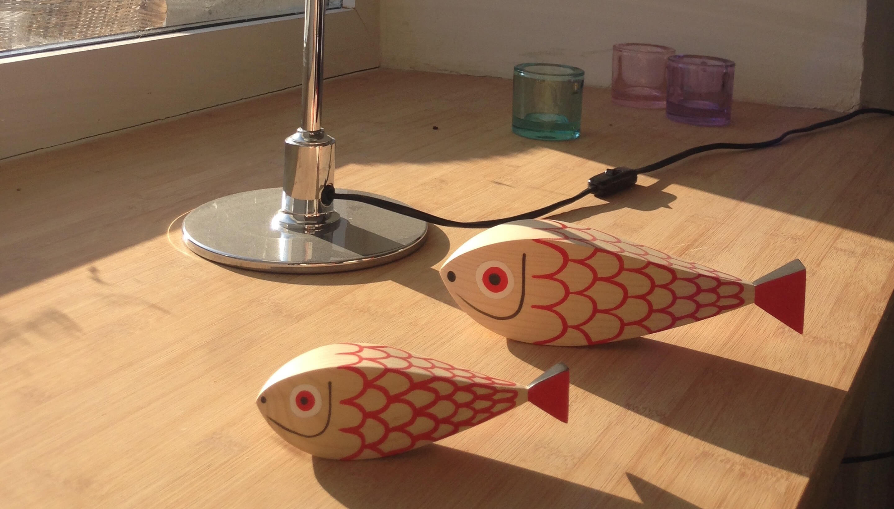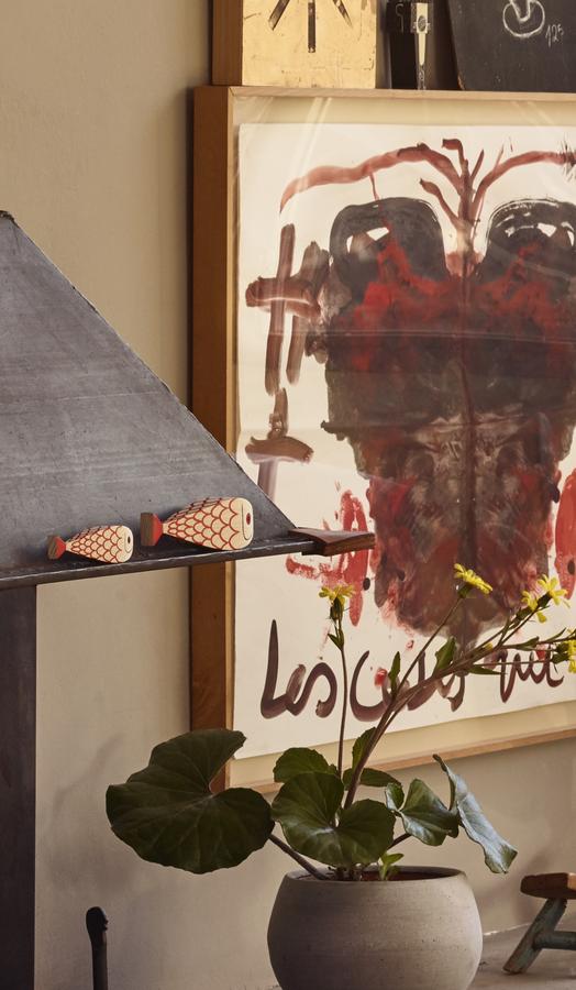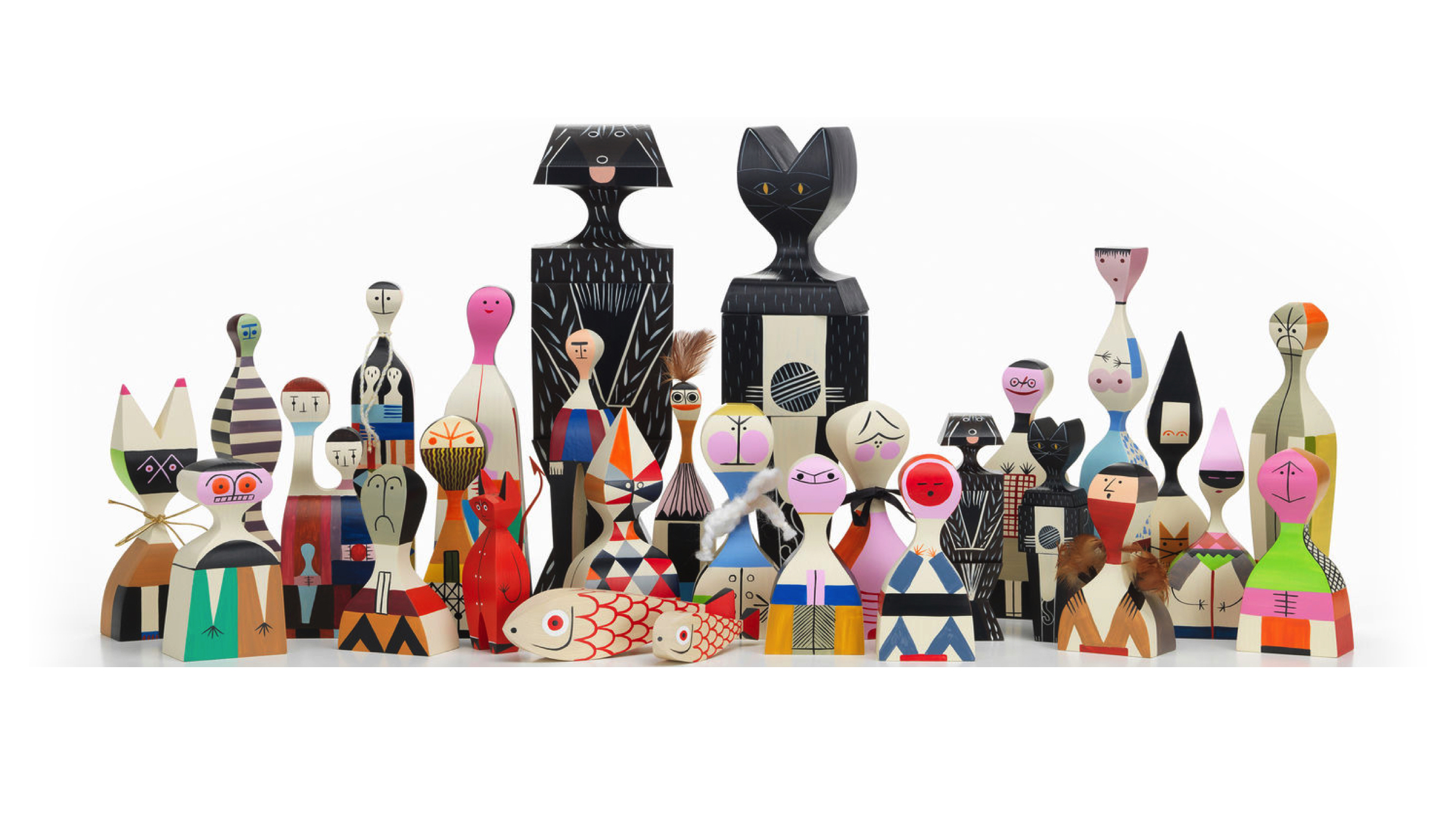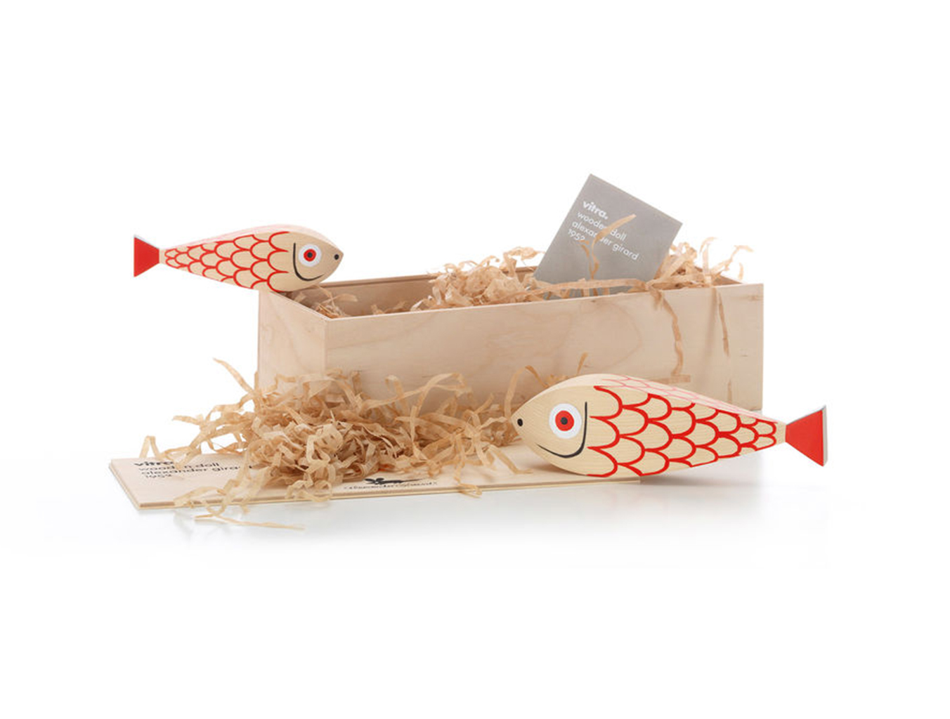 两条鱼 - 一位母亲和她的小母狗 - 将动物世界的另一个主题添加到亚历山大吉拉德的木制娃娃的欢乐家庭中。 它们的水平方向使它们与大型娃娃系列中其他人物的站姿相区别。