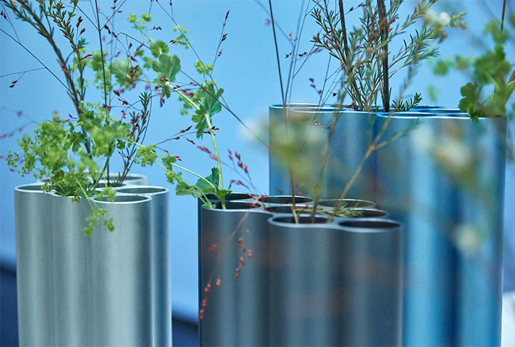 对于Nuage花瓶,华体会体育官方在线官网在不同长度的挤压铝型材中执行了云图案。基本形式的空腔现在直立放置,将花瓶分成八个单独的管,可用于巧妙地布置花和草。起伏的表面采用各种颜色的阳极氧化处理,营造出明亮的光影效果。由于其精确的外部轮廓,花瓶可以安装在一起,形成完整的“云层”。