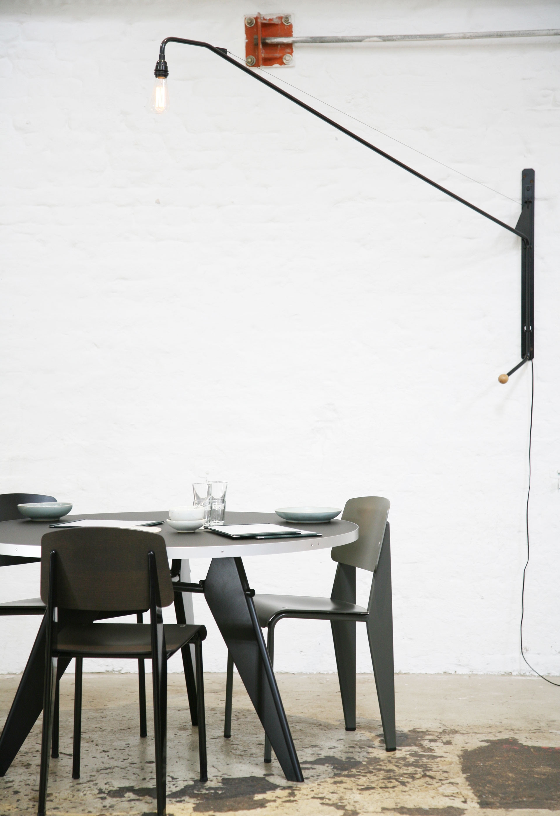 Potence壁灯是JeanProuvé的纯粹杰作之一。 减少了必需品 - 一个灯泡和一个旋转壁挂 - 长摆臂壁灯由粉末涂层管状钢制成,带有山毛榉木手柄。 灯由调光器控制,并配有灯泡。