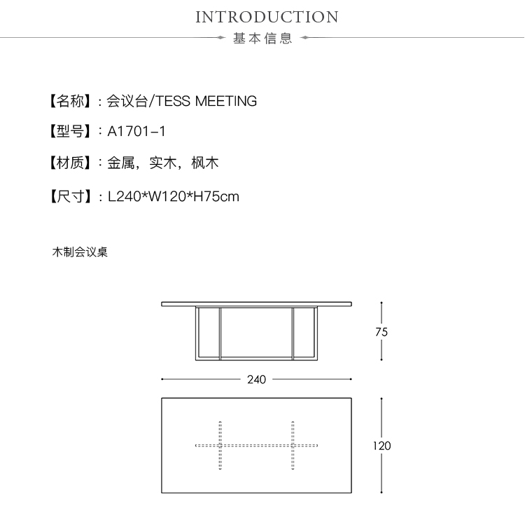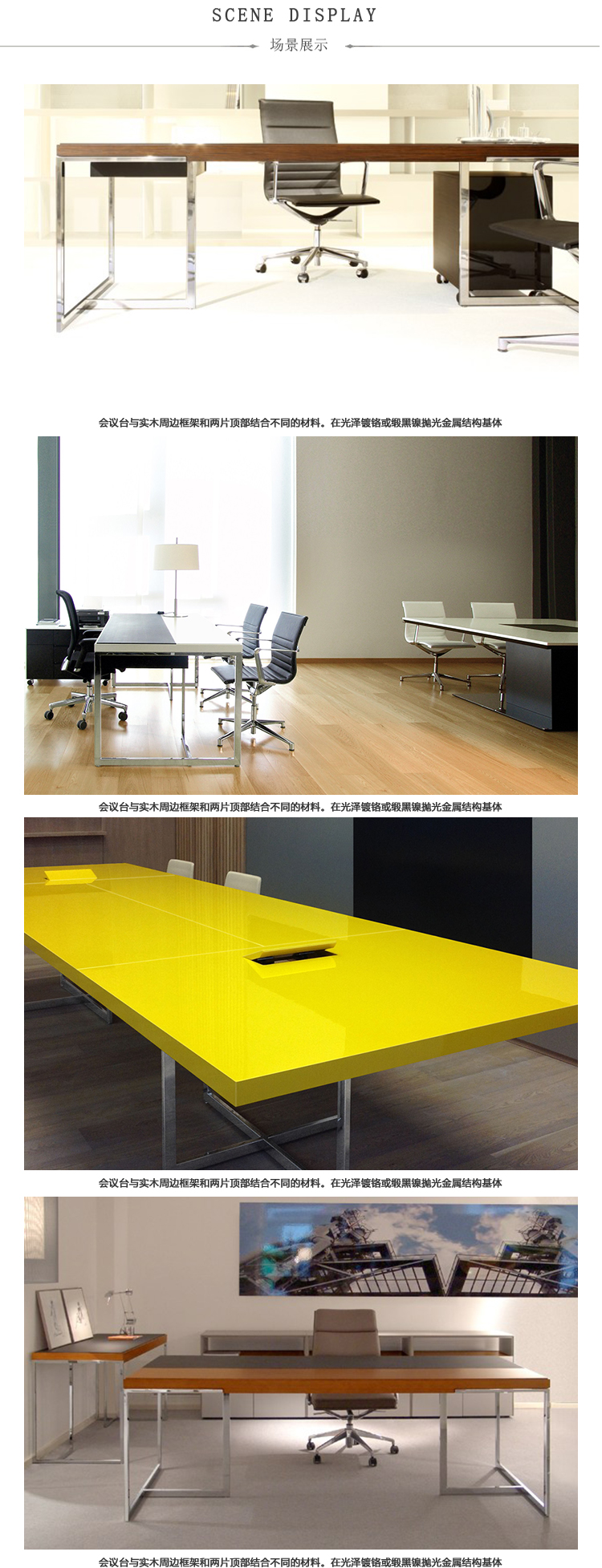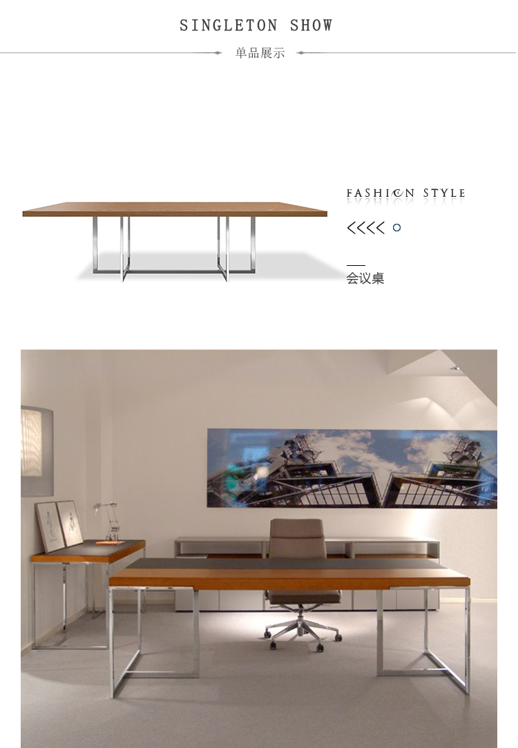 会议桌。50mm厚的一体式矩形顶部。抛光不锈钢结构底座。表面处理:木质饰面或微纹理漆面。金属底座采用抛光不锈钢制成。