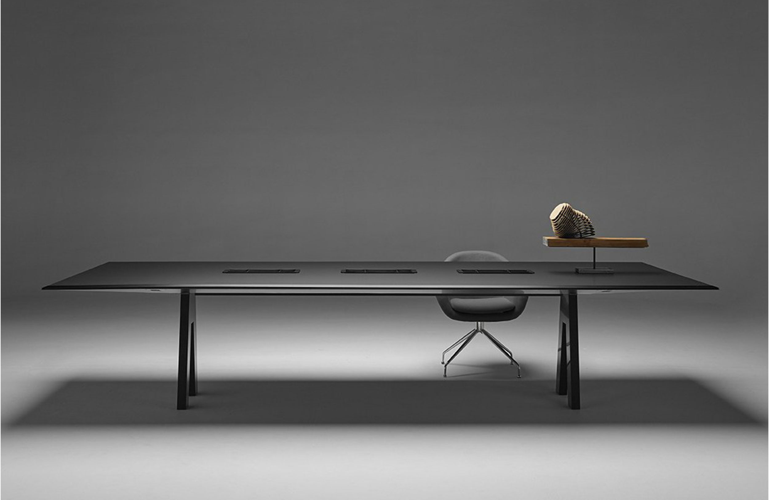 共同工作表。轻型结构底座,由4条倾斜支腿组成,采用漆面HDF(高密度纤维板)制成。顶部由折叠钢板制成,带有明显的斜面,形成10毫米厚的顶部。顶部突出的悬垂使其具有类似飞机机翼的轻盈感。顶级成品木材,漆或软垫Tech-Leather。包括电气化托盘(电气元件和电缆,不包括在内)。可拆卸笔筒/漆面漆面。可以用FéNIX材料(白色或黑色)完成桌面,并采用彩色不锈钢表面处理。
