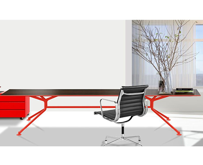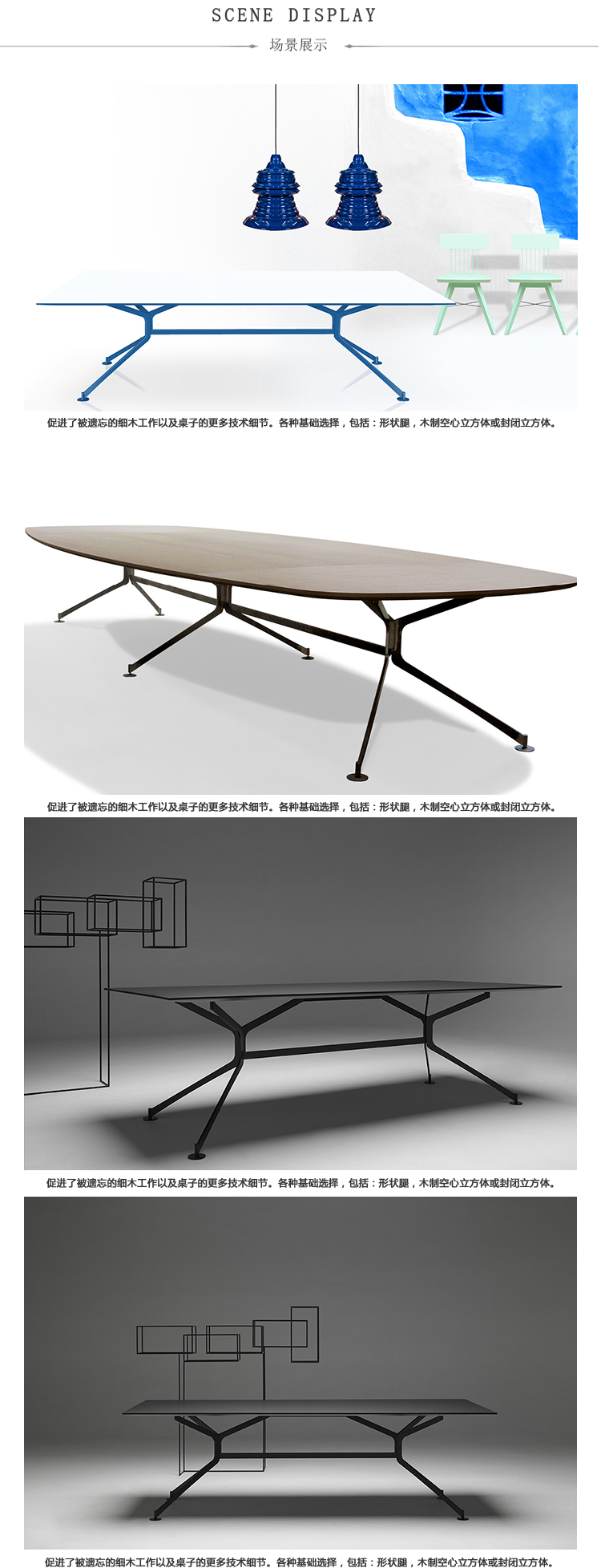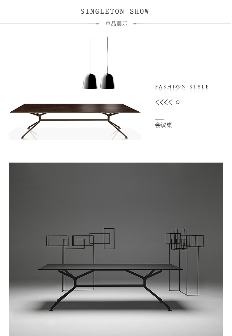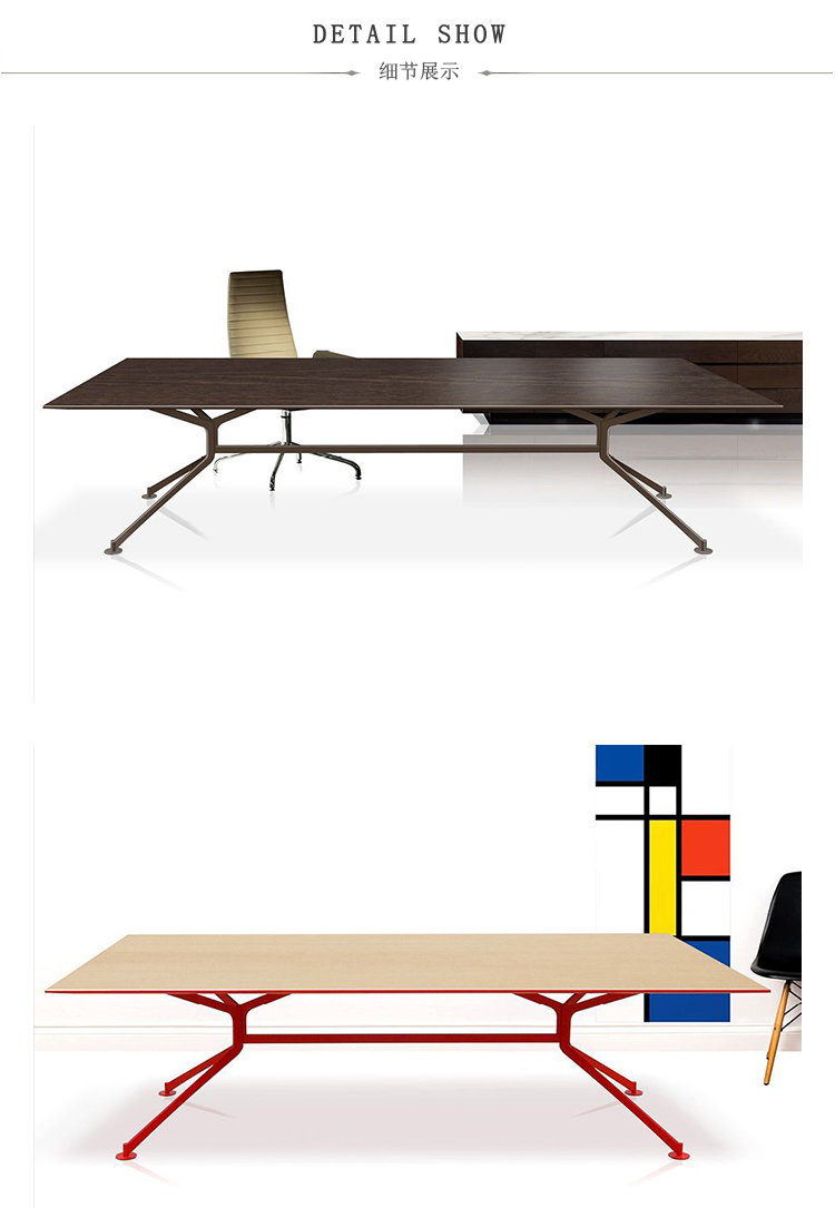 会议桌。30mm一体式矩形桌面,底部有10mm直角和90mm锋利的斜边。激光切割金属板腿结构。表面处理:顶部采用木材或微纹理漆面处理。金属底座采用微纹理漆面处理。