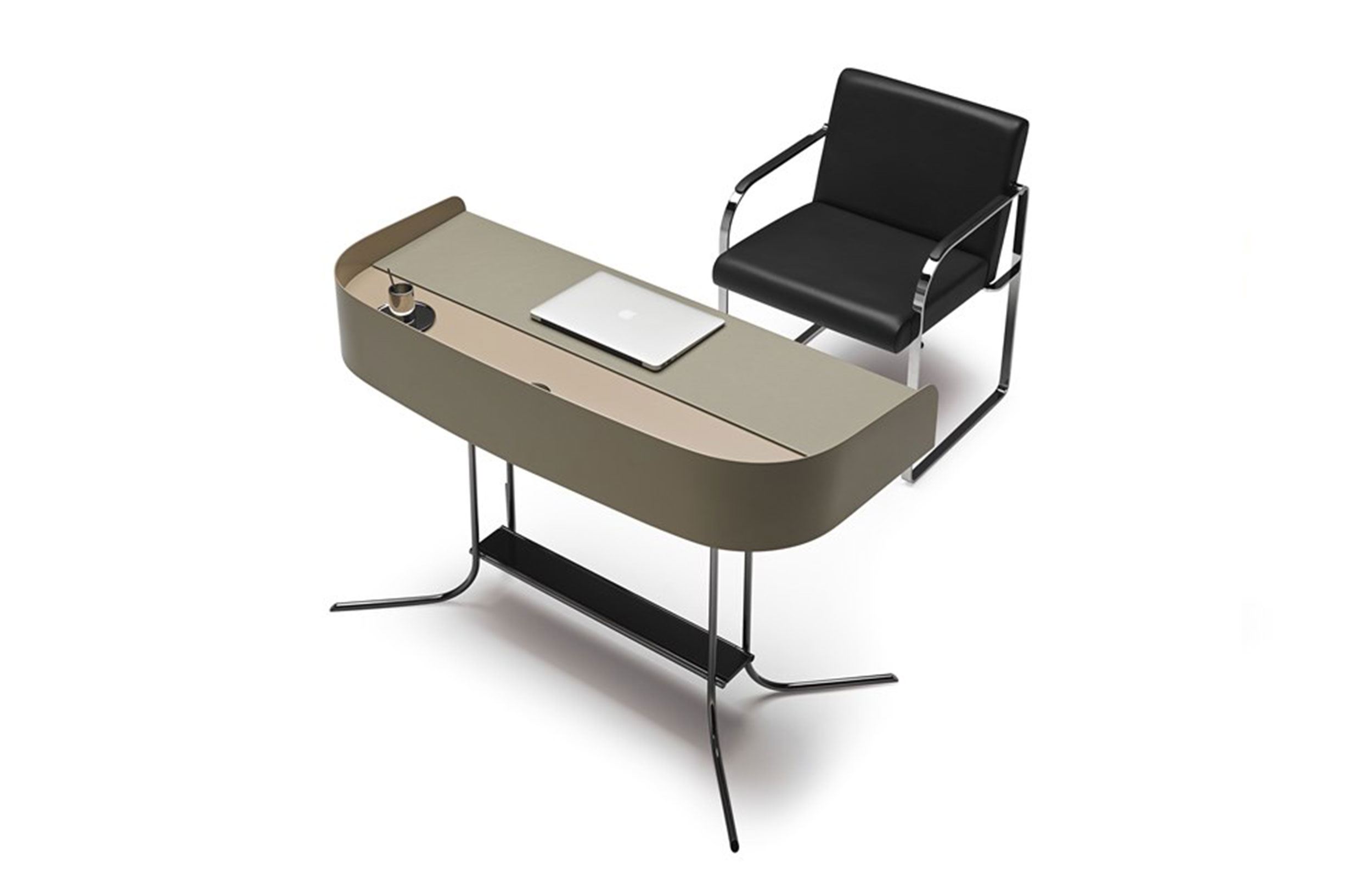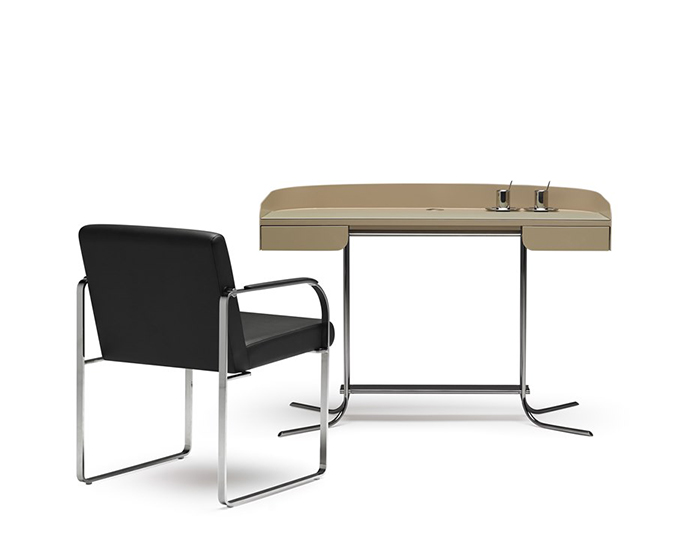 多用途桌子。漆面,背面和侧板有凸起的屏幕。工作区域有软垫表面。桌子两侧配有2个铅笔托盘,中央区域清晰。圆柱形实心挤压金属框架和结构杆结合了实木和金属。
