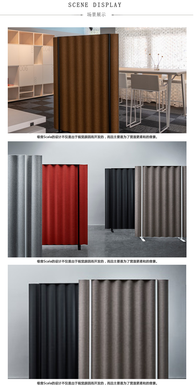 Scala是一个完整的系列屏幕。Scala可以安装在墙壁上,悬挂在天花板上,也可以作为独立式地板屏幕,桌面屏幕和悬挂室分隔板使用。对于地板和桌面屏幕,Anya Sebton开发了由钢管组成的支架,突出了设计的自发方式。