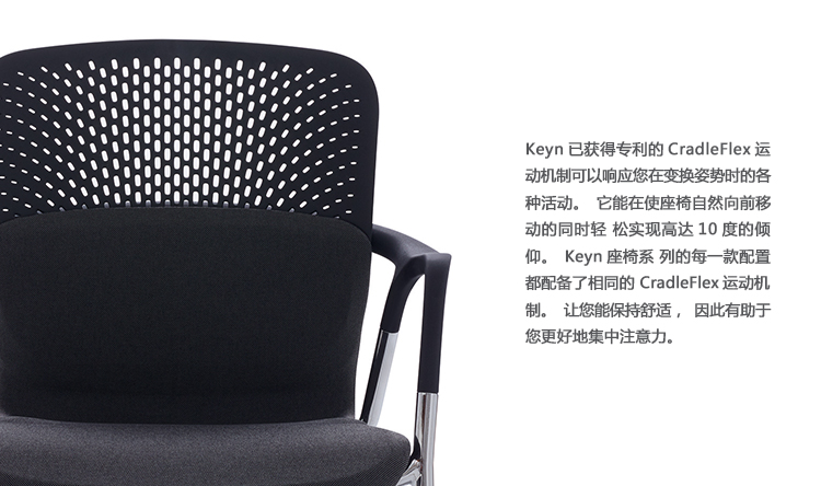 Keyn座椅系列是一套会议和单椅的组合,能为协作式的空间提供响应式的运动机制和即时的舒适感。由伦敦设计团队forpeople设计的这款产品,使用了四个关键部件来创作此系列中的每个型号的产品,所以每款产品都能保持一样的视觉吸引力。Keyn的CradleFlex运动机制能响应姿势的变换,倾仰角度可达10度,能为您带来令人愉悦的舒适感