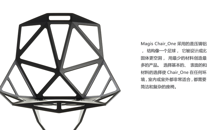 最受瞩目的德国华体会体育官方在线官网Konstantin Grcic 应邀为MAGIS 设计的Chair One(几何吧椅),是设计生涯中最具有标志的产品之一。办公椅体为模铸铝合金结构,经过氟化钛镀膜与塑料粉末涂布。椅子具有阻燃性、抗腐蚀性。适合室内及室外使用。以铝金属与钛金属制成的 Chair One,以多个平面以不同角度组合而成,建立起立体的外型。多个中空的三角型组合而成的座椅,不但令为用家带来强而有力的承托结构,而且还能在简单设计之中带出不一样的风格。这把椅子的惊人形象难免使人对它的舒适度产生疑问,但当你真正坐于其上,你会发现它实际上非常舒适,那些稀疏的网状结构能够极好地支撑不同体型的人体,后背上的把手也非常实用。当你知道Chair-One最初是被当作户外用椅而设计的,你会更加佩服Konstantin Grcic的缜密用心:极少的表面可以杜绝雨水,并且减少灰尘堆积,夸张的形态则令它能够在街道、建筑或自然的环境中拥有自己美学上的存在,而不是被环境所吞没。Konstantin Grcic花了三年时间设计Chair One,自2003年诞生以来,堪称Grcic精简主义风格的代表作。2006年,Chiar One为Konstantin Grcic赢得了德国政府的设计大奖。