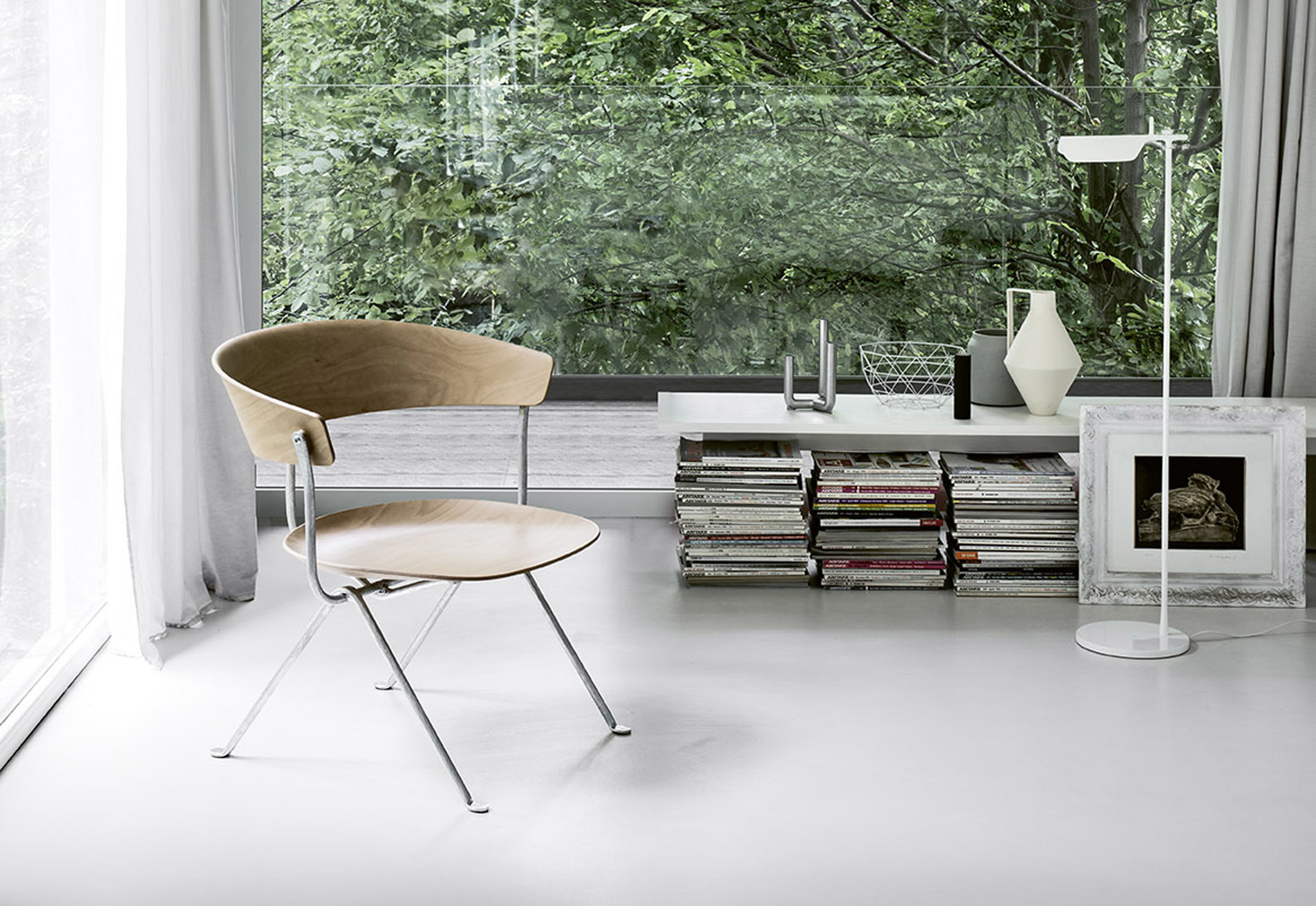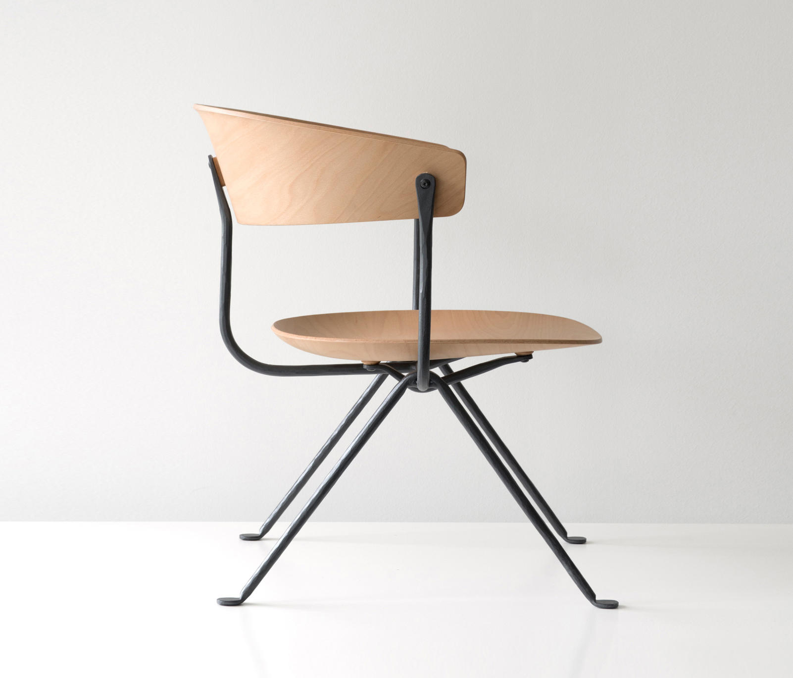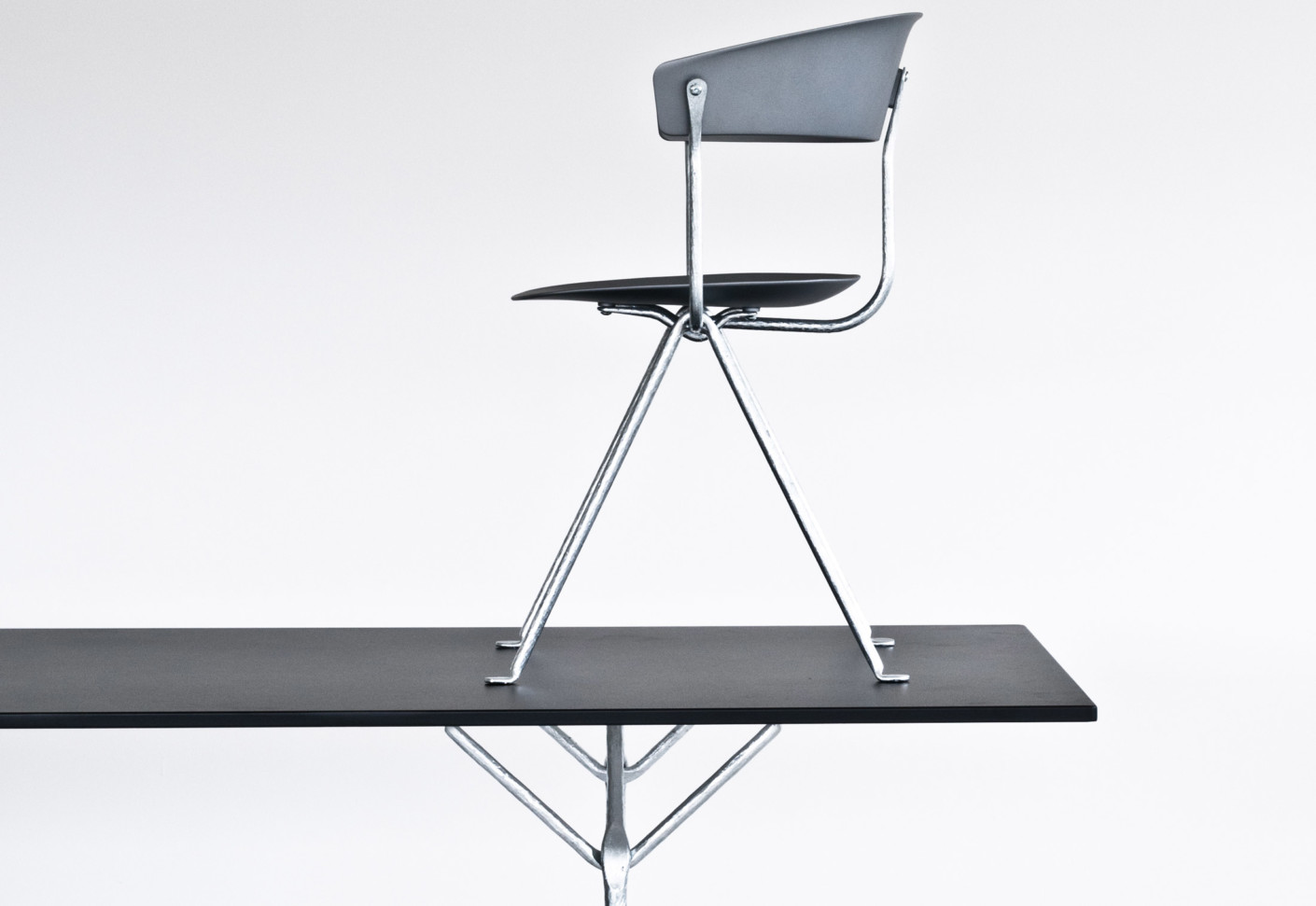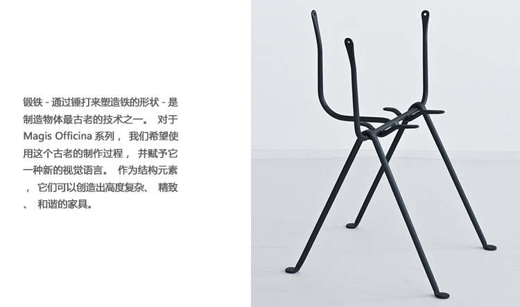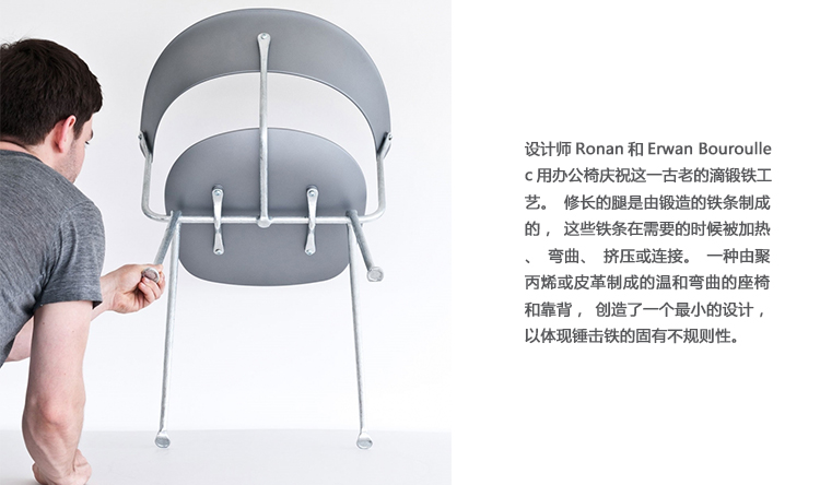 华体会体育官方在线官网Ronan和Erwan Bouroullec用办公椅庆祝这一古老的滴锻铁工艺。修长的腿是由锻造的铁条制成的,这些铁条在需要的时候被加热、弯曲、挤压或连接。一个轻微弯曲的座位和由聚丙烯或皮革制成的靠背被设置在顶部,创造了一个最小的设计来庆祝锤铁固有的不规则。