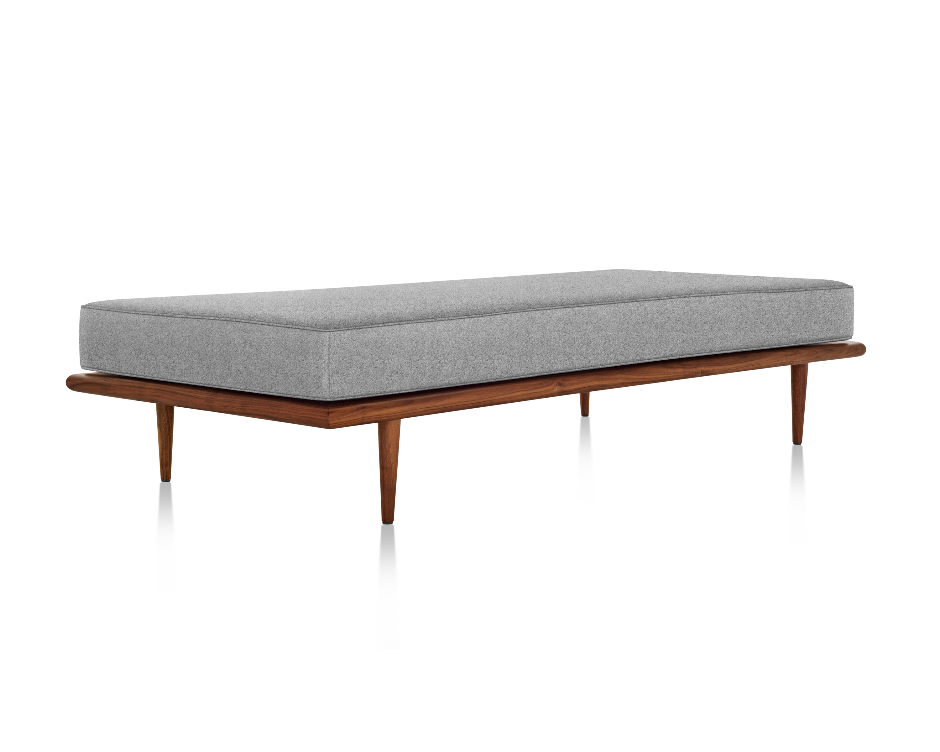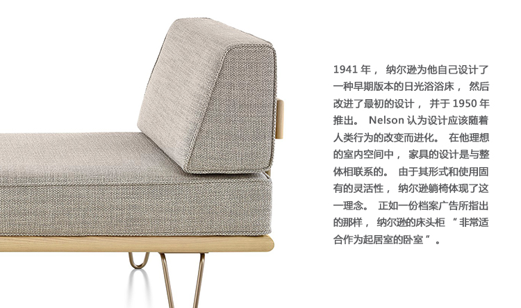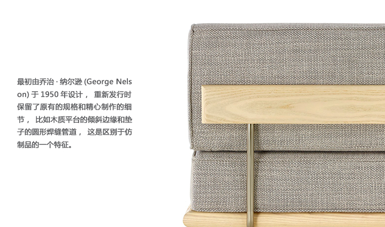 最初由乔治?纳尔逊(George Nelson)于1950年设计,重新发行时保留了原有的规格和精心制作的细节,比如木质平台的倾斜边缘和垫子的圆形焊缝管道,这是区别于仿制品的一个特征。不锈钢发夹腿或锥形木腿给它的经典纳尔逊触摸。缓冲增强了双密度泡沫,以更多的支持和耐久性,同时保持其轻质美学。随着住宅和公寓的面积不断缩小,纳尔逊牌(Nelson)躺椅等多功能家具为任何房间增添了一种实用而精致的感觉。