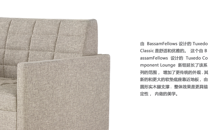 Tuxedo休闲座椅由细窄的钢腿提供支撑,金属支腿有6种饰面可选,靠背和(可选)扶手形成一条水平横线,让座椅的整个线条轮廓看起来十分低沉、流畅。超薄、双层泡沫衬垫外面包裹清新定制的装饰,让沙发看起来更加轻巧。每款装饰系列都包括有绗缝或无绗缝两种选项。