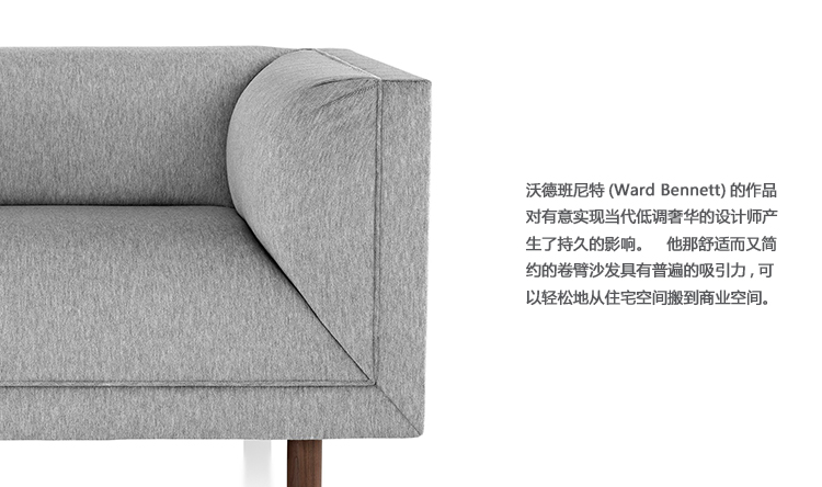 Ward Bennett的作品对追求现代低调奢华的华体会体育官方在线官网具有深远的影响。他设计的Rolled Arm沙发典雅而又简约,散发出迷人魅力,并可轻松满足家居和商用空间的需求。宽大的矮腿设计具有建筑上的层次感,利落的斜接软垫打造了优雅廓形。Rolled Arm架在凹陷的硬木腿上,以胡桃木或白蜡木精制而成,共有三种沙发尺寸,亦有俱乐部椅款式。