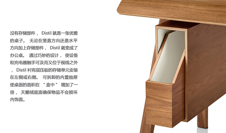 没有存储部件,Distil就是一张优雅的桌子。无论在竖直方向还是水平方向加上存储部件,Distil就变成了办公桌。通过巧妙的设计,使设备和充电器触手可及而又位于视线之外,Distil衬有层压板的存储单元安装在左侧或右侧。可拆卸的内置抽屉使桌面的面积在“盒中”增加了一倍,天鹅绒底面确保物品不会损坏内饰面。