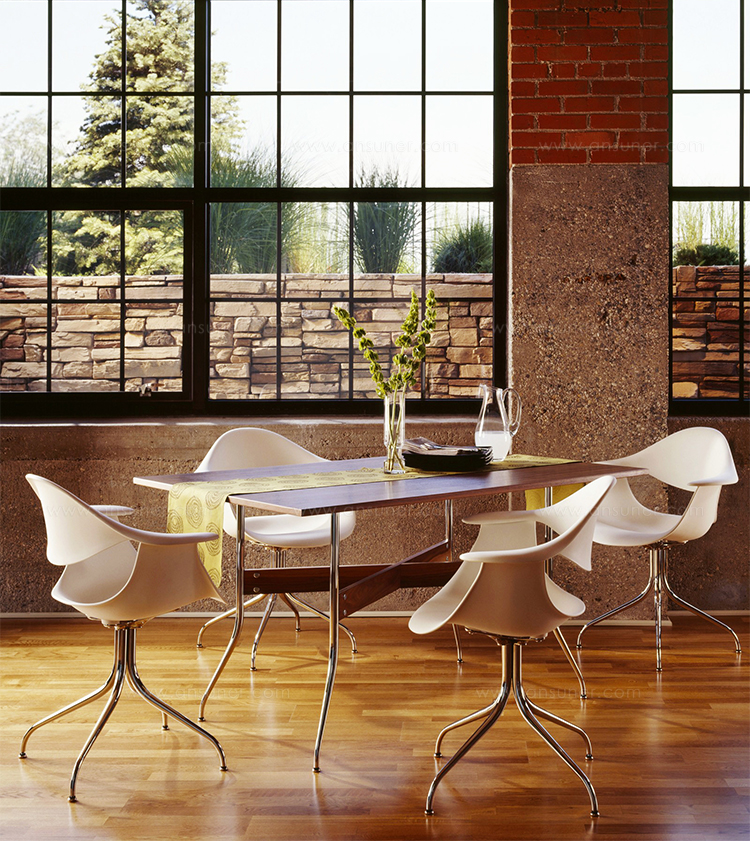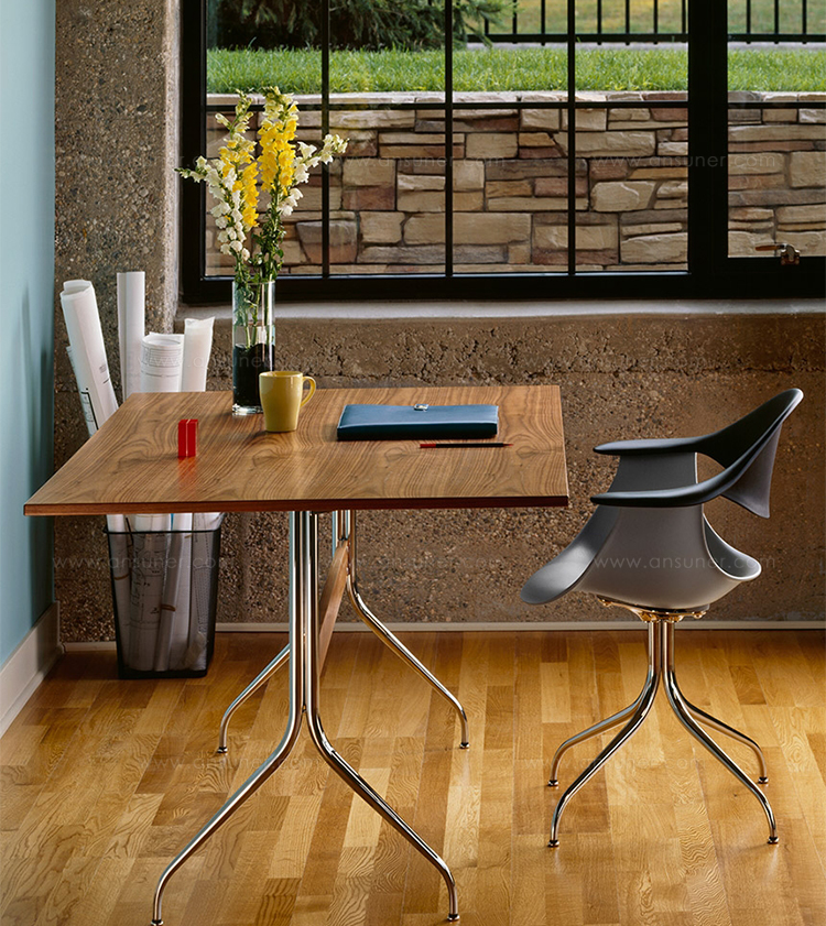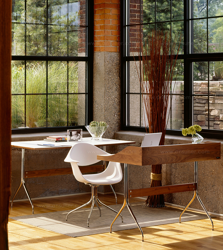 在George Nelson设计出Nelson swag leg系列产品50年后重新推出这款经典产品,主要是因为不管是其外观、尺寸还是功能都非常符合现代顾客的要求。这款办公桌的尺寸非常适合放置笔记本电脑或移动设备底座,并且能有效地利用您家里或办公室的空间。这一系列产品是办公室、会议室和饭厅的理想选择。