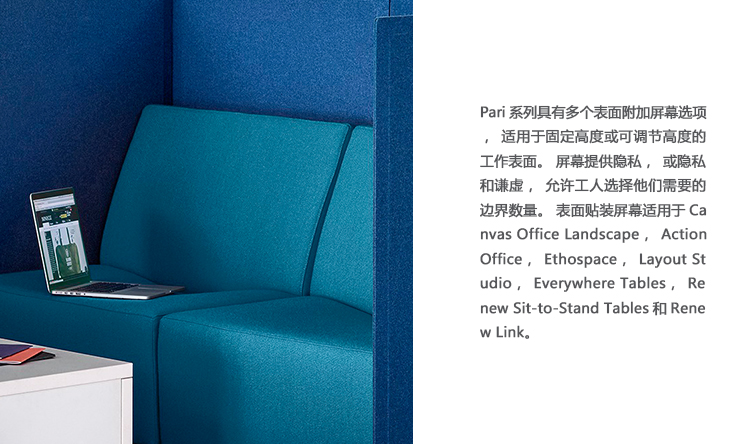 Pari是一个屏幕系列。 有些版本是独立式的,有些版本是贴在表面或框架上的,所有版本都是可粘的,并且共享无框架,薄的外形。 它们一致的细节和互补的颜色有助于美学的连续性,因为它们描绘了空间并提供了隐私。 Pari Screens与许多Herman Miller产品兼容,可在办公室环境中进行设置。 使用Pari Screens,组织可以压缩工作站并在较低的墙壁高度进行标准化,而不会牺牲员工所需的隐私,以便他们可以集中注意力,或创建个人空间的边界让他们感到舒适。
