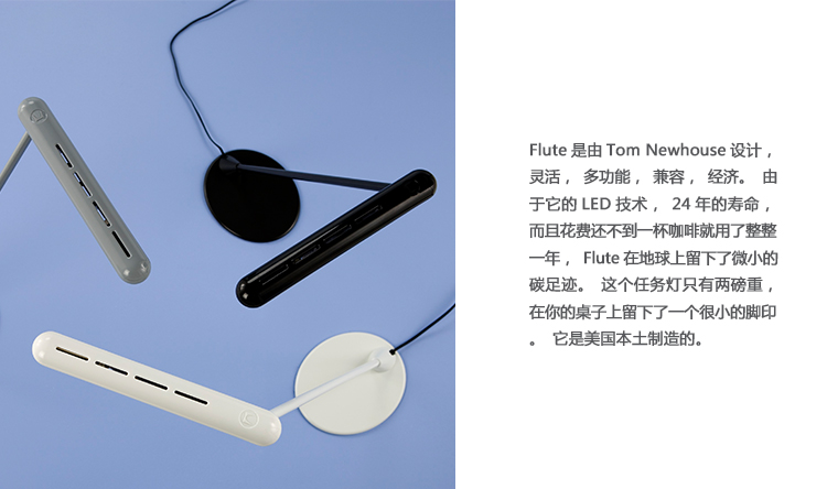 Flute是由Tom Newhouse设计,灵活,多功能,兼容,经济。由于它的LED技术,24年的寿命,而且花费还不到一杯咖啡就用了整整一年,Flute在地球上留下了微小的碳足迹。这个任务灯只有两磅重,在你的桌子上留下了一个很小的脚印。它是美国本土制造的。