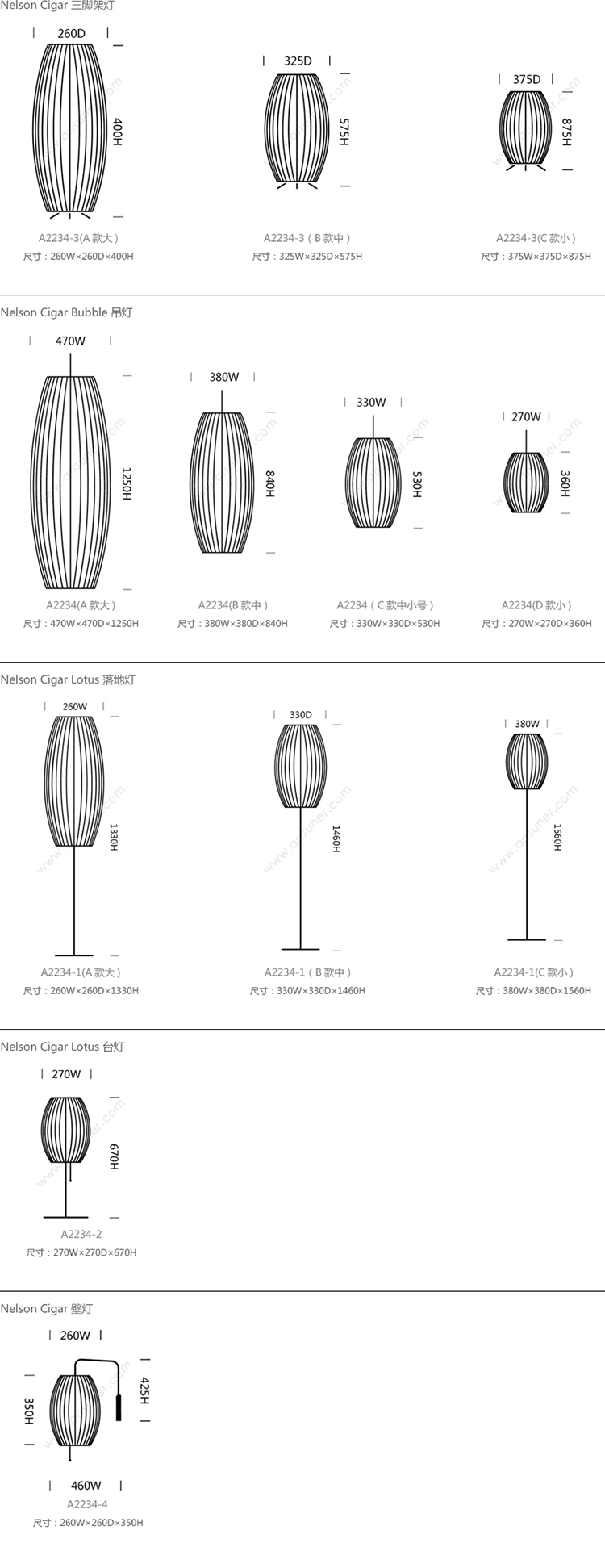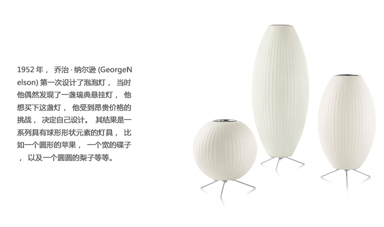 Nelson Cigar三脚架灯有三种尺寸,小型,中型和大型,可以搭配不同尺寸的空间。 每种尺寸包括一根7.5英尺的插入式电源线。 乔治·尼尔森于1952年首次设计了泡泡灯,当时他遇到了一个他希望为办公室购买的瑞典吊灯。 他受到昂贵的价格的挑战,并决定自己做。 结果是一系列具有元素,球形形状的灯,如圆形苹果,宽碟和梨形等。