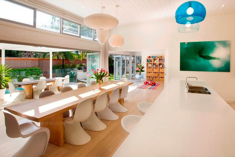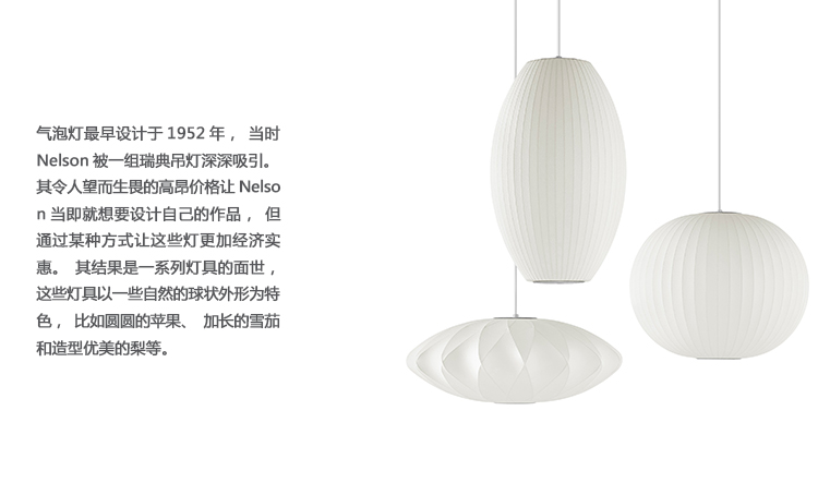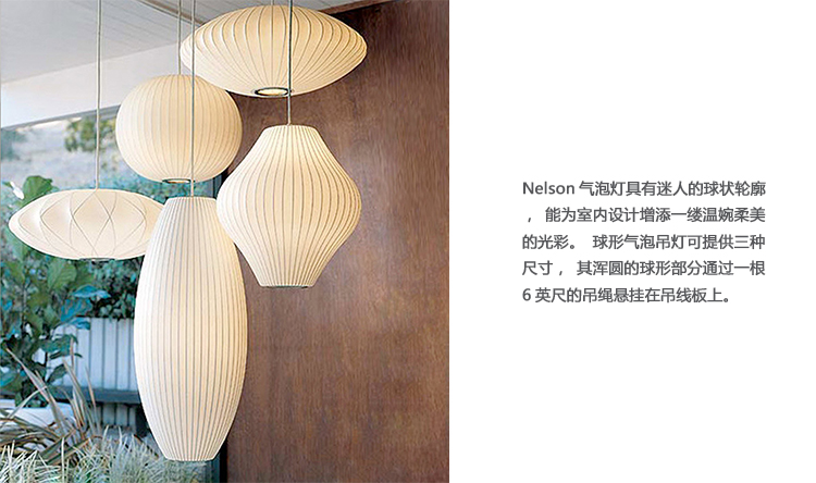 Nelson气泡灯具有迷人的球状轮廓,能为室内设计增添一缕温婉柔美的光彩。球形气泡吊灯可提供三种尺寸,其浑圆的球形部分通过一根6英尺的吊绳悬挂在吊线板上。气泡灯最早设计于1952年,当时Nelson被一组瑞典吊灯深深吸引。其令人望而生畏的高昂价格让Nelson当即就想要设计自己的作品,但通过某种方式让这些灯更加经济实惠。其结果是一系列灯具的面世,这些灯具以一些自然的球状外形为特色,比如圆圆的苹果、加长的雪茄和造型优美的梨等。