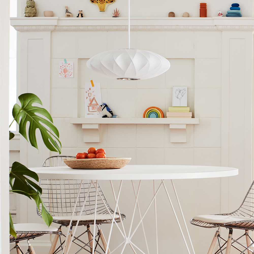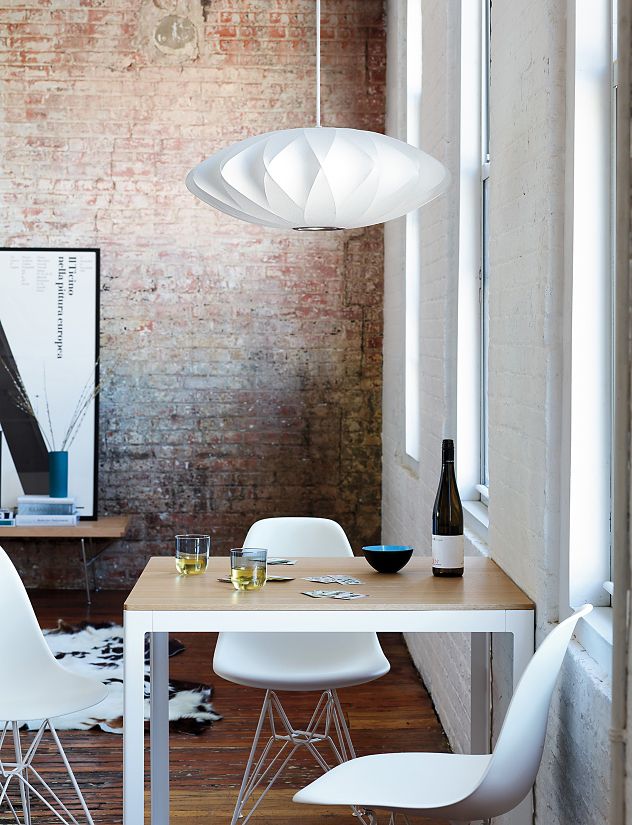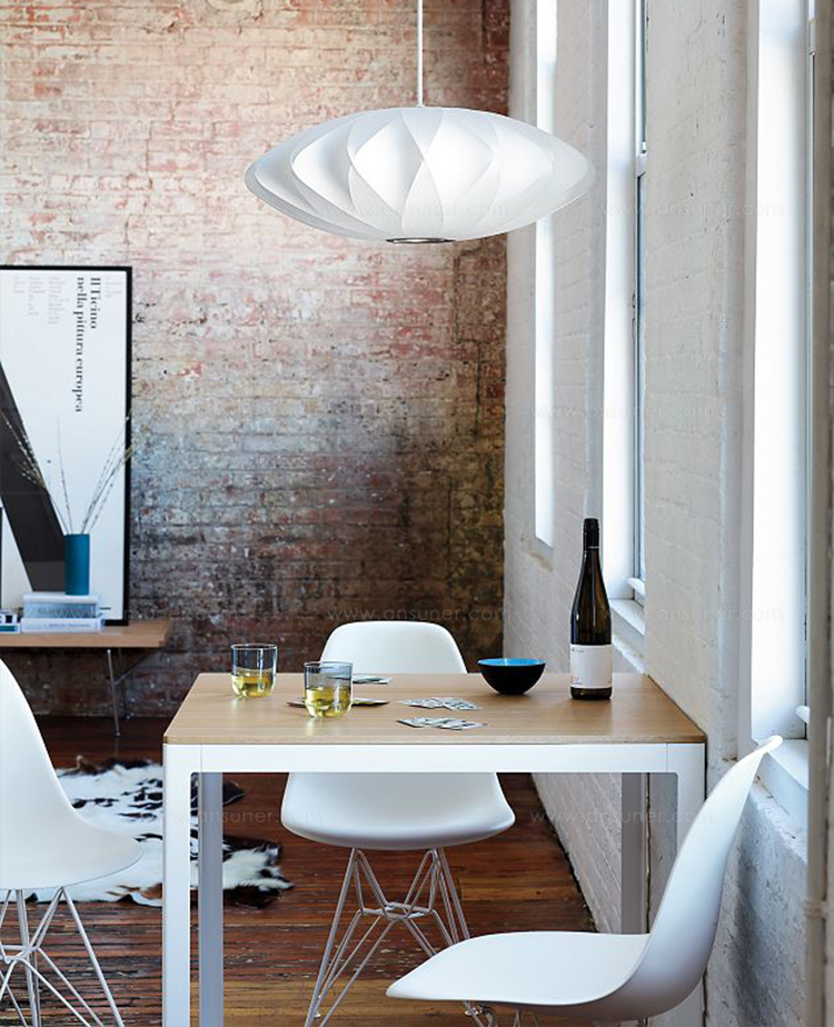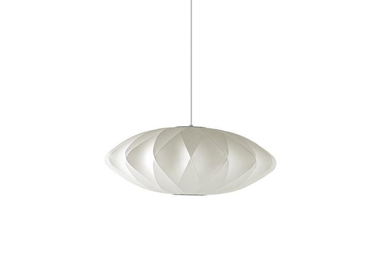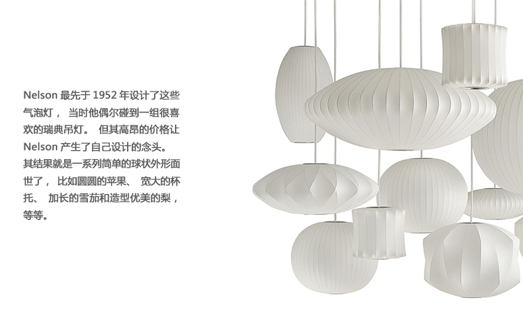 Nelson Saucer Crisscross Bubble Pendant杯托型十字气泡吊灯是George Nelson的一款经典设计,其下层结构中的对分图案能给灯罩留下一个很可爱的轮廓。与本款吊灯配套的6英尺的吊绳可以将吊灯牵在吊线板上,悠然悬挂在头顶。Nelson最先于1952年设计了这些气泡灯,当时他偶尔碰到一组很喜欢的瑞典吊灯。但其高昂的价格让Nelson产生了自己设计的念头。其结果就是一系列简单的球状外形面世了,比如圆圆的苹果、宽大的杯托、加长的雪茄和造型优美的梨,等等。