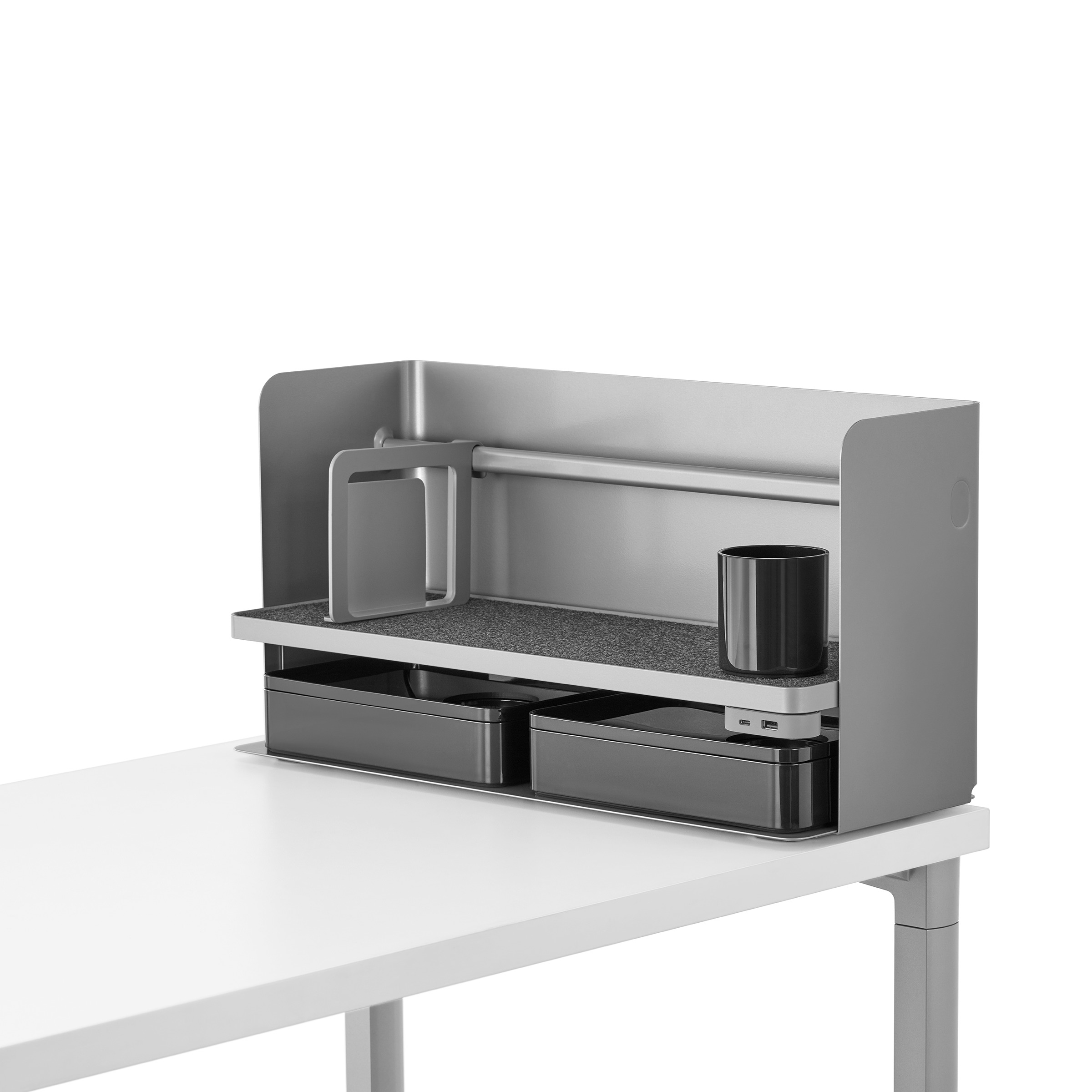考虑到占据家庭及办公室空间的笨重物品的存放问题,Sam Hecht和Kim Colin设计了具有可拆卸盖子的储物盒。每个盖子上设计有孔洞,可供放置移动式笔筒。或者,笔筒可固定于储物盒内部孔洞下方压槽中,从而在无需打开盖子的情况下便可接触杯中物品。