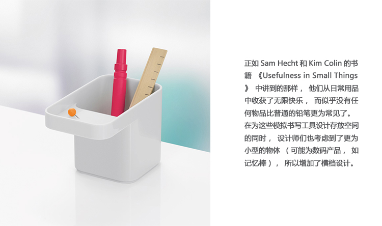 正如Sam Hecht和Kim Colin的书籍《Usefulness in Small Things》中讲到的那样,他们从日常用品中收获了无限快乐,而似乎没有任何物品比普通的铅笔更为常见了。在为这些模拟书写工具设计存放空间的同时,华体会体育官方在线官网们也考虑到了更为小型的物体(可能为数码产品,如记忆棒),所以增加了横档设计。