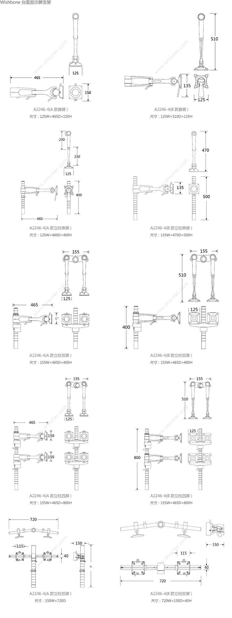 Wishbone 台面显示屏支架 系列尺寸/示意图