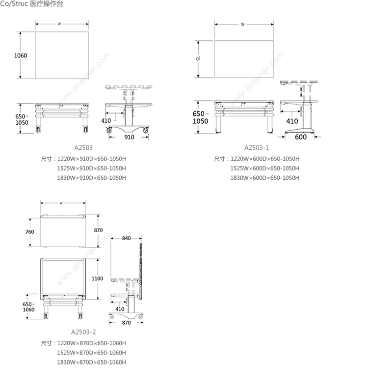 Co/Struc 医疗操作台 系列尺寸/示意图