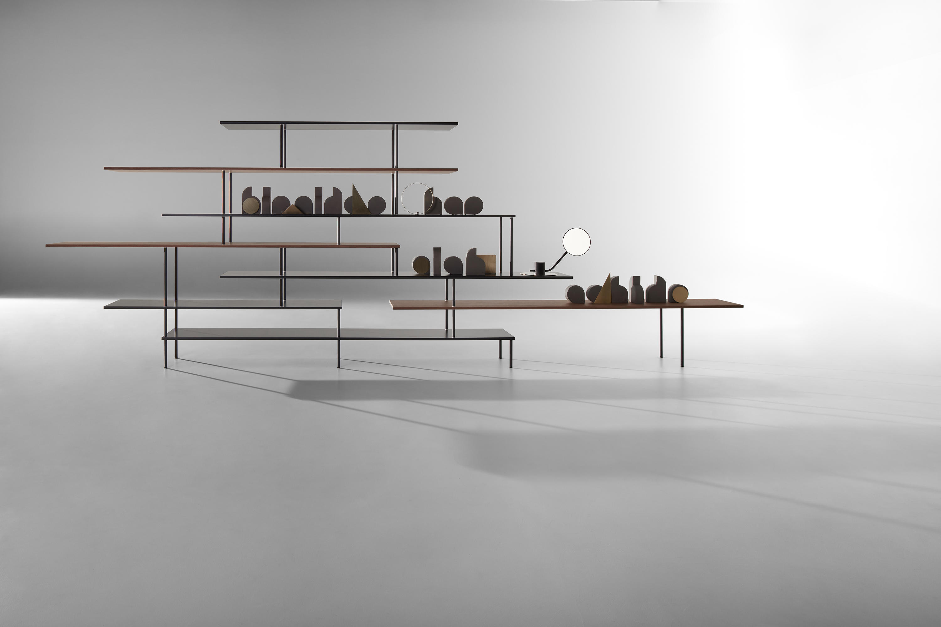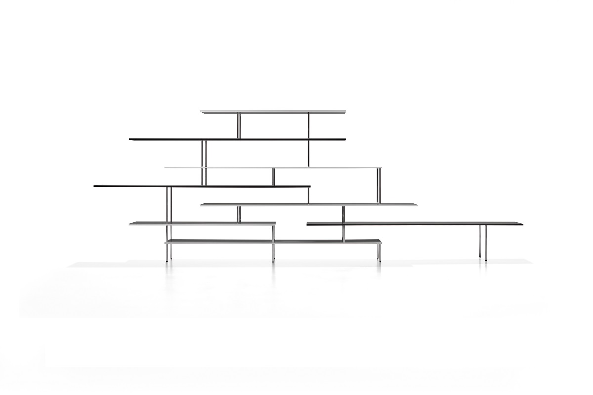 新成分:F,G,H,I,J 新饰面:哑光古铜色,哑光黑尼科尔漆,Canaletto胡桃木和漂白橡木。 正式的轻巧,图形标志,简单的设计,和谐的美学,必要性是让·努维尔设计(Jean Nouvel Design)设计的Super_Position书柜系列的标志。 重叠的线表示对水平度的重视。不间断的垂直线穿过架子,就像小跳水板一样延伸到空隙中。 物件,花瓶和雕塑可以在空的空间,重叠线的中间或末端的壁express中表达其比例差异。” Jean Nouvel