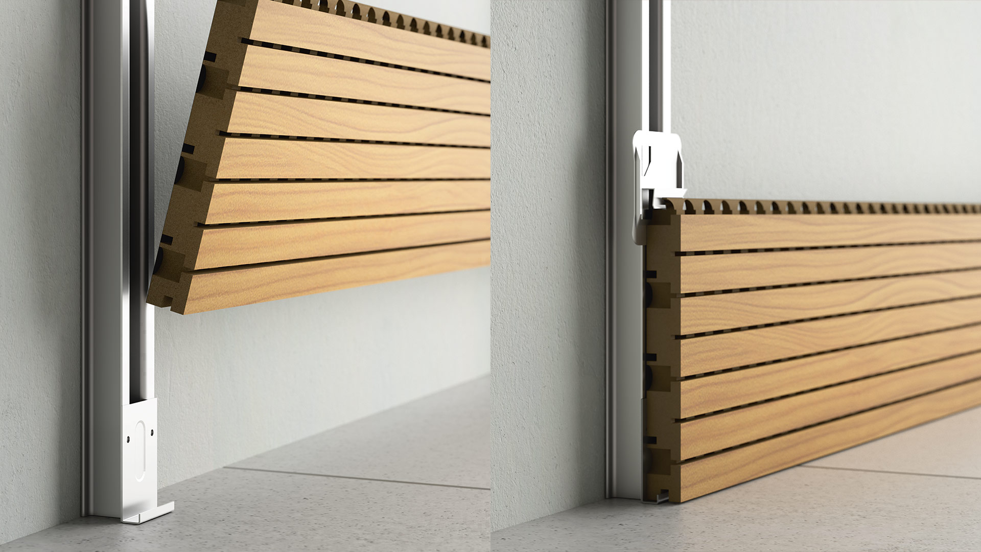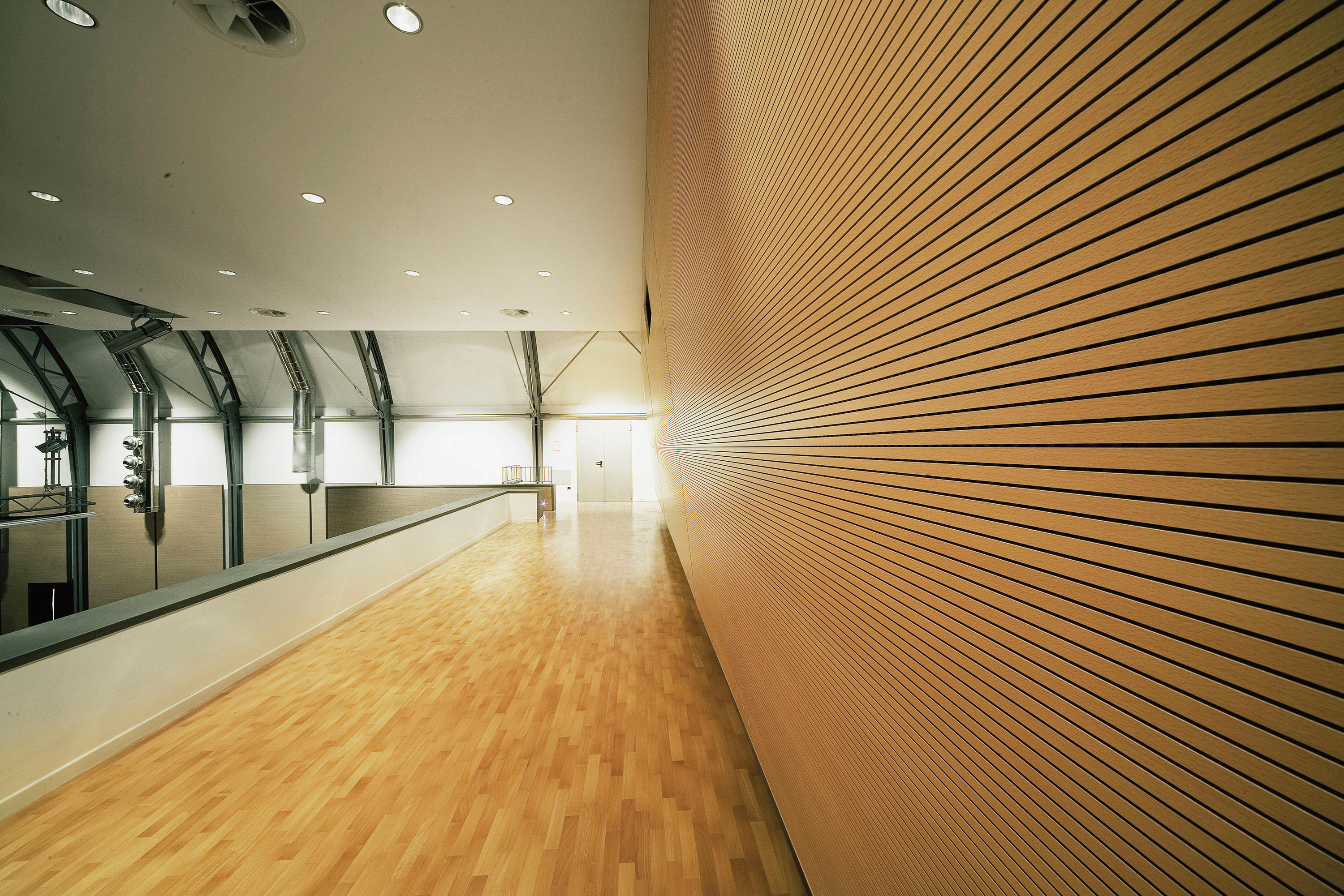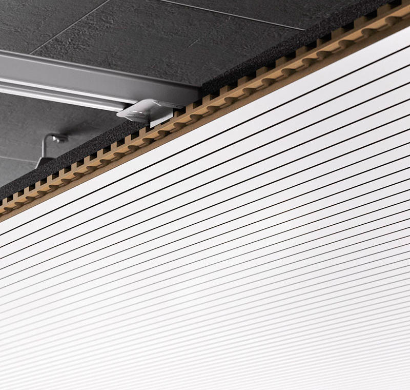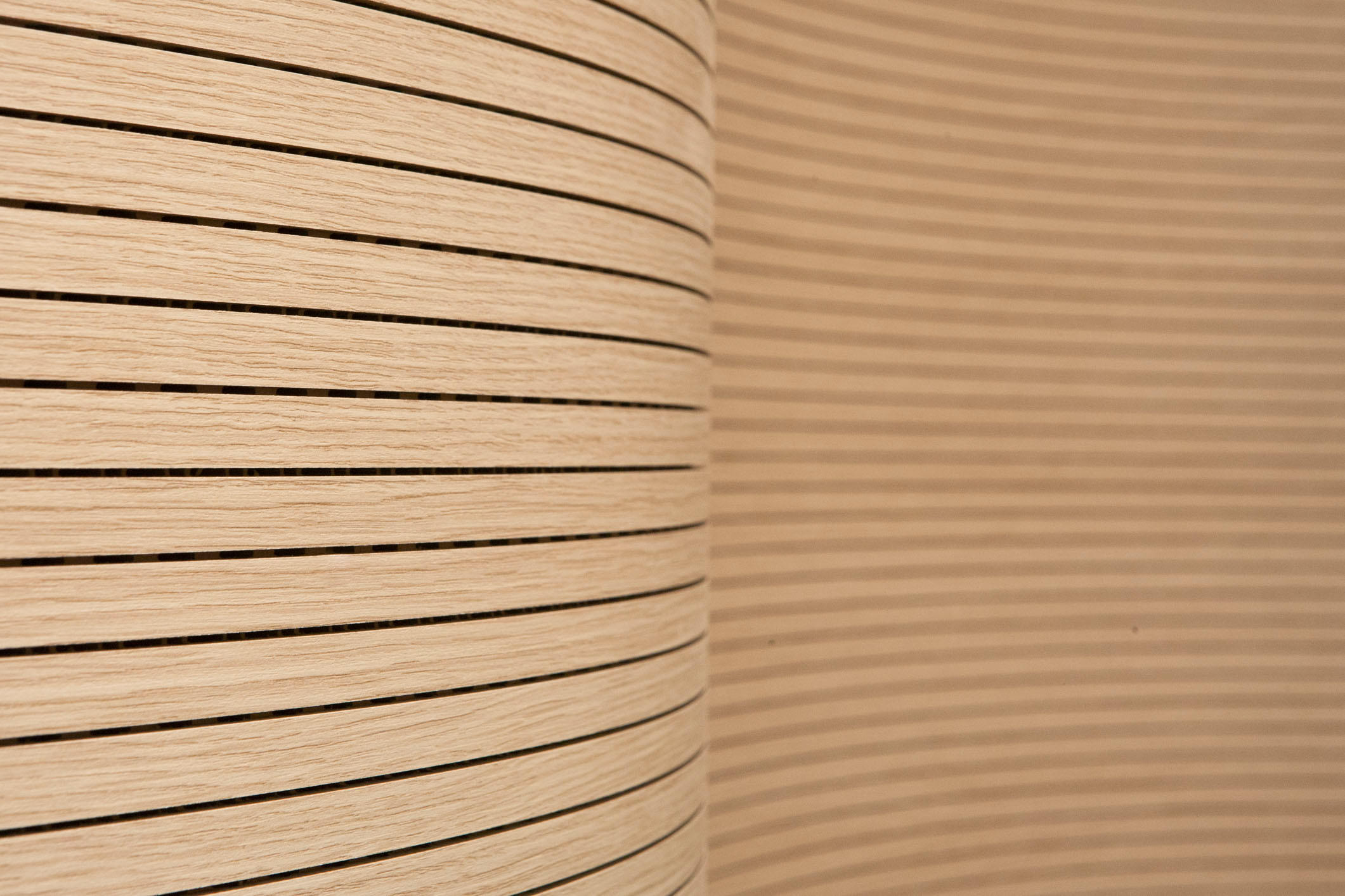 4akustik。 用于墙壁和天花板的吸音系统,包括三聚氰胺面,上光或贴面的MDF板条。 通过对亥姆霍兹共鸣器理论的研究以及使用多孔纹理的声音消散,可以实现较高的性能水平。 4akustik结合了出色的吸音性能和最高的健康与安全标准。 该面板在其EC认证版本中,由于其对火的反应而被分类为“ B-s2,d0”,并且由于其极低的甲醛含量,还符合高度严格的日本“ F4星”标准,符合 JIS参数。 同样的产品也可提供未经燃烧反应认证且甲醛排放量为E1级的版本。