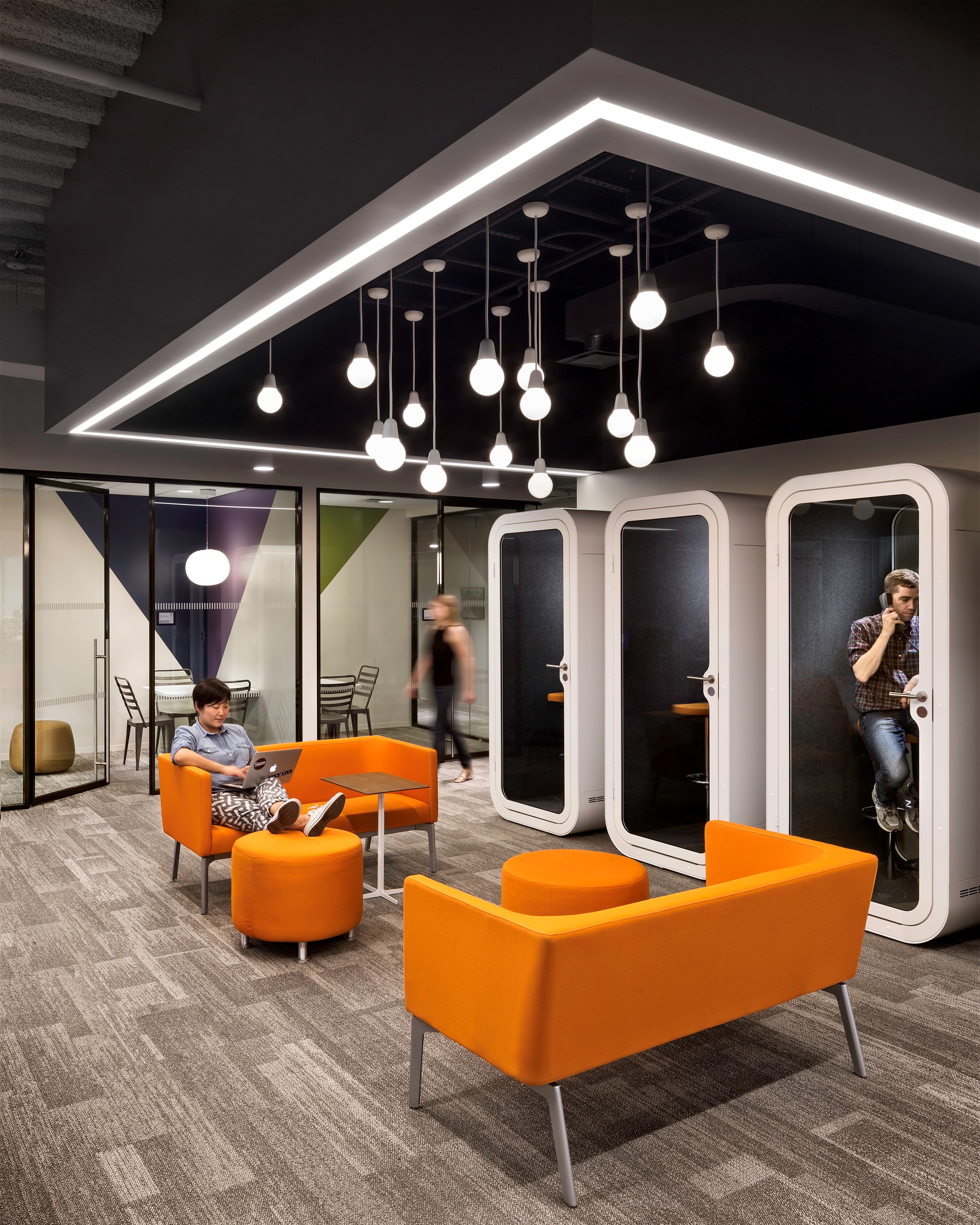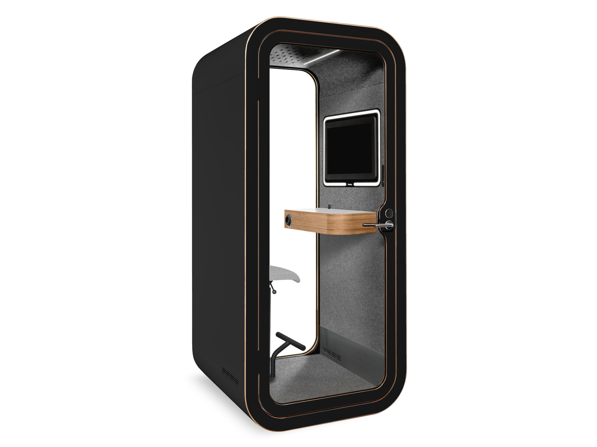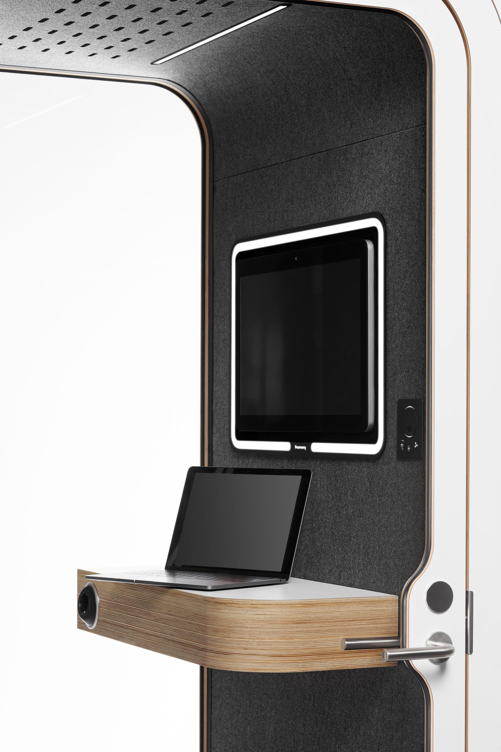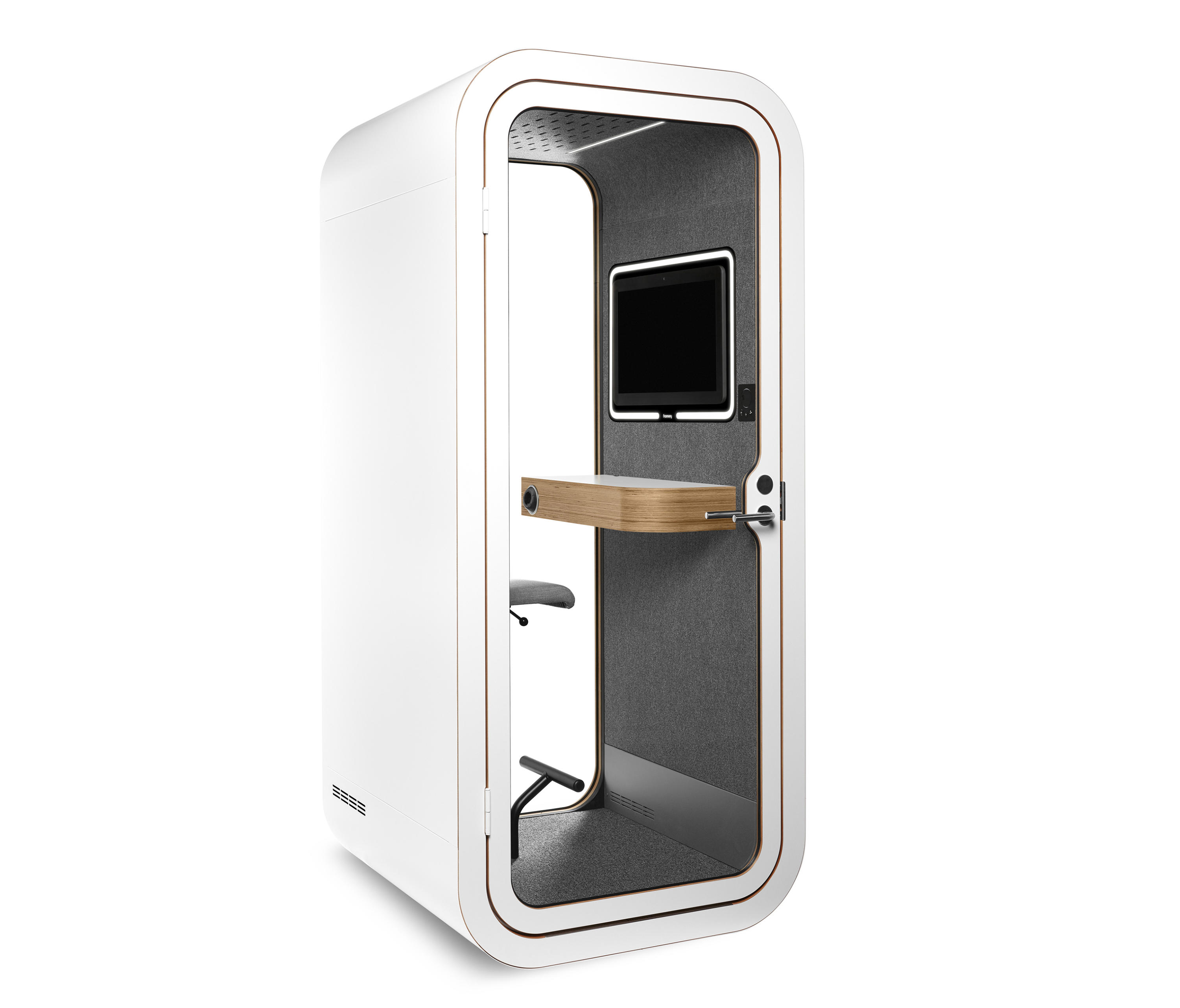 简单而显著。 FrameryØ荚是一个声音隔离工作区非常适合打私人电话,视频会议和艰巨的任务,它减少了在开放式办公室的噪声和释放的潜力提高整个组织的日常生活个人。它可以提高生产率并减少工作繁忙-这样,Framery可以提高员工的满意度。通过简单的组装,可以根据现有的平面图轻松地将吊舱放置在办公室周围并进行重新安置,从而使人们可以快速摆脱噪音。 步骤为视频会议的隔音世界的倾斜屏支架Framery o视频会议准备就绪可以将各种类型的屏幕连接到吊舱的墙上。您可以将显示器或多功能计算机固定在屏幕支架上。屏幕周围的LED照明为视频会议提供了最佳照明。控制面板,可以调节照明和气流。