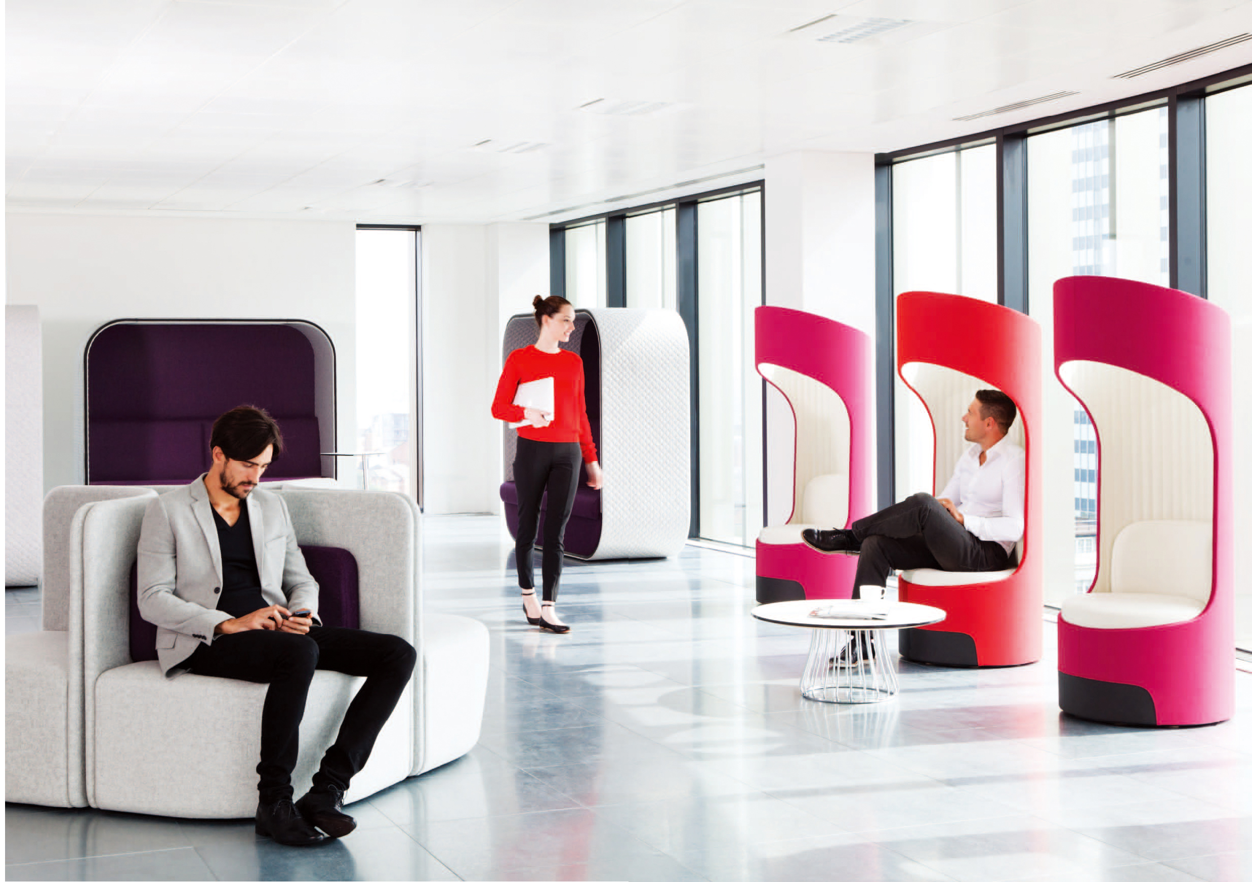 舒适且符合人体工程学要求的蚕茧(Cocoon)为非正式环境创造了理想的会议空间。这种高的、软垫的结构可以吸收周围环境的背景噪音,而不需要内部结构。