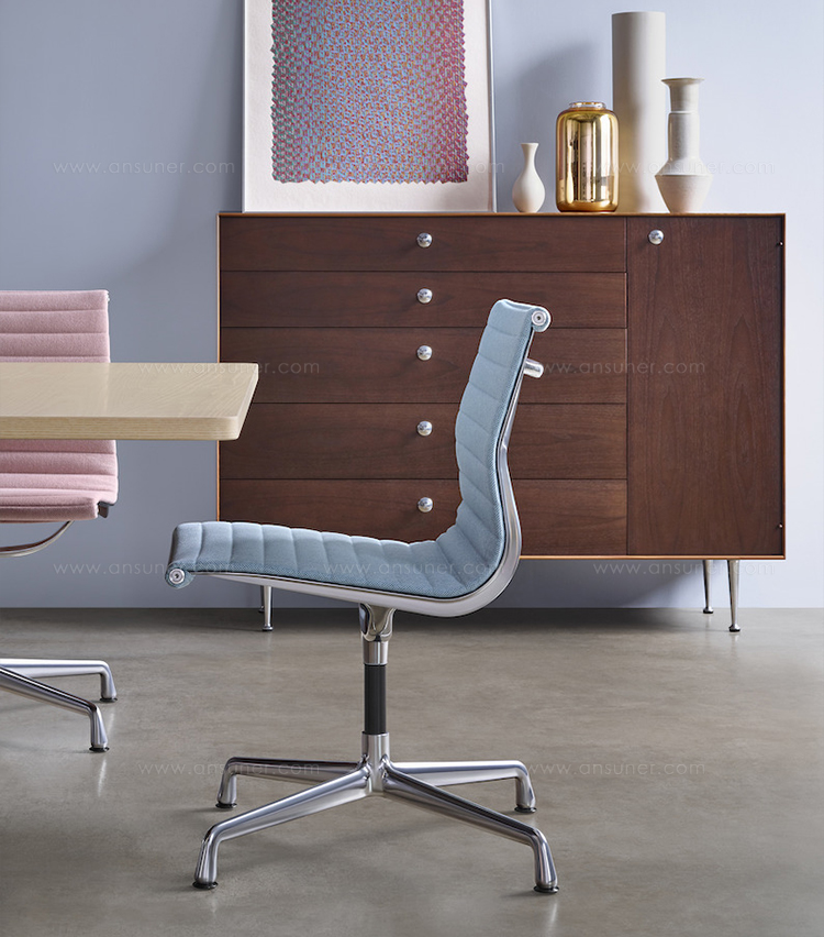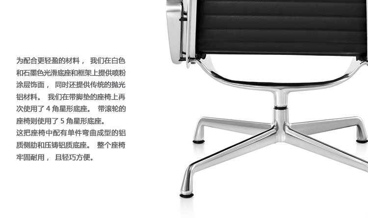 Charles与RayEames夫妇是20世纪最有影响力的华体会体育官方在线官网,卓越的设计涵盖了家具、建筑、影像与平面设计。他们从二次世界大战中美国海军的实验计画中学习经验并发展可谓是现今工业中使用模铸胶合版的先锋,这对设计界的超级夫妇档自1940年参与了由MOMA举办的有机家具设计大赛,自今已有近百件他们的作品被各大博物馆所永久典藏。 Eames® Soft Pad Side Chair(伊姆斯软包会议椅)是夫妻俩1958年设计的,是在全铝系列的基础上发展的另一系列Eames产品。舒适系列在全铝的椅架上增加了皮革制的柔软坐垫和靠背,高级铝合金制作,压模四星脚,可旋转。背垫和坐垫,采用西皮,具有透气性强,内部填充高密度定型绵,不易变形,不老化,依人体坐姿,符合人体工学,耐水及对人体无害等优势。椅子扶手选用优质电镀铝合金扶手,手感舒适,永久不生锈。转椅底盘为多功能底盘,可以保护使用者长时间坐用腿部健康,且作为高度可多定位调节。气压棒采用的气杆是正规厂家出产的外贸气杆,每一根气杆都有钢印,经过严格SGS检测的才可出厂,旋转、升降自如基本无声响,使用寿命长,可承受250kg,可升降数万次,将椅面调至与膝盖同高时,使用者坐下后双脚跟可垂直平放于地上,且大腿与地面平行,最符合人体工学理论,使用者长期久坐,也不想疲惫。办公椅脚为铝合金材质永久不生锈、承受能力强,安全更放心。椅子脚轮采用优质电镀片脚轮,耐用而美观,可以随意变换位置,贴心更方便,具有防震及防松脱,让椅子的安全性能更加可靠。
