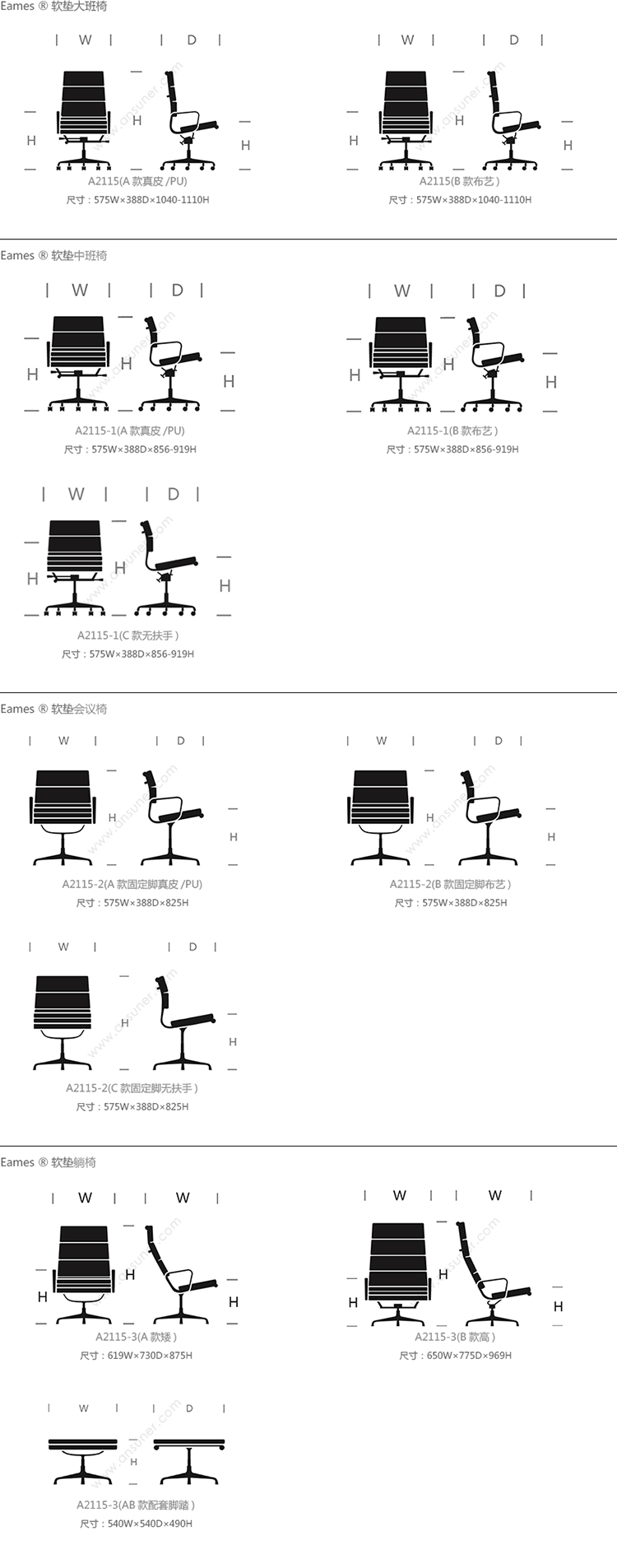 Eames®软垫大班椅 系列尺寸/示意图