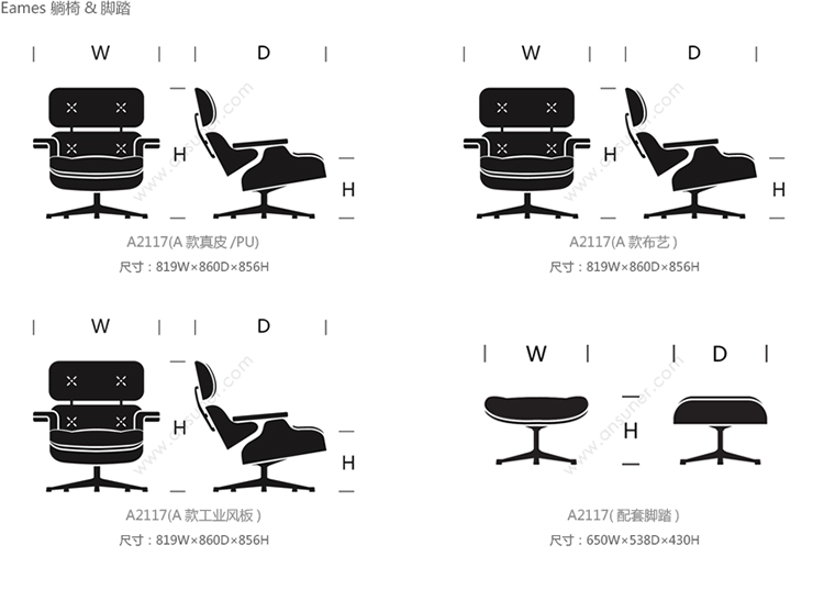 Eames 躺椅&脚踏 系列尺寸/示意图