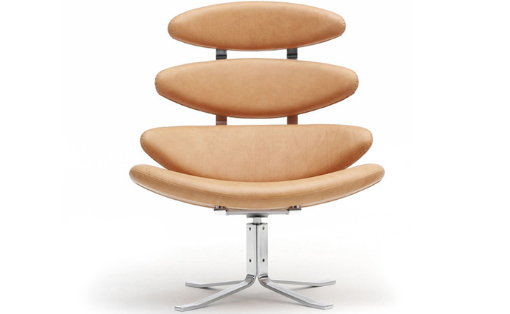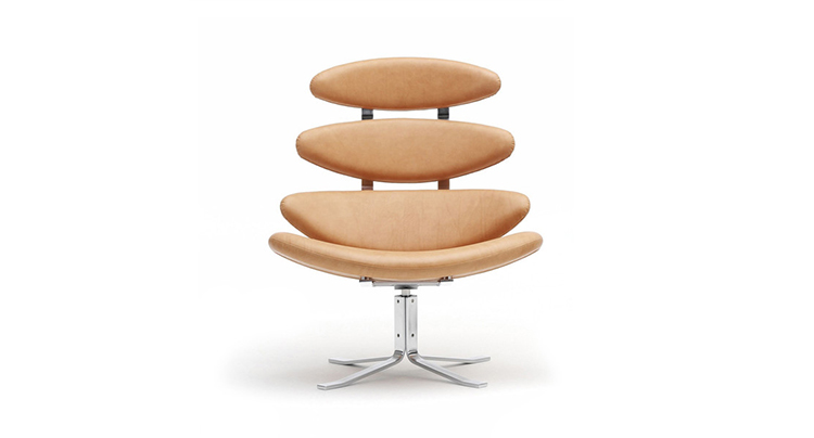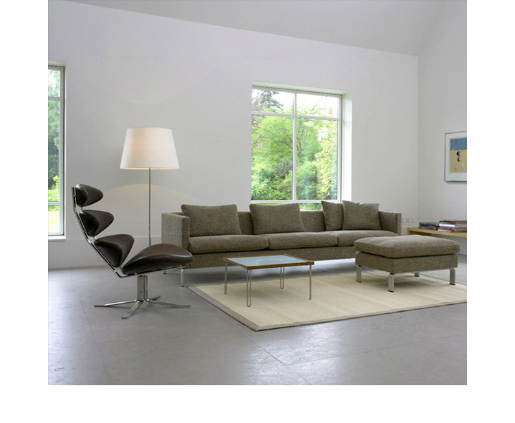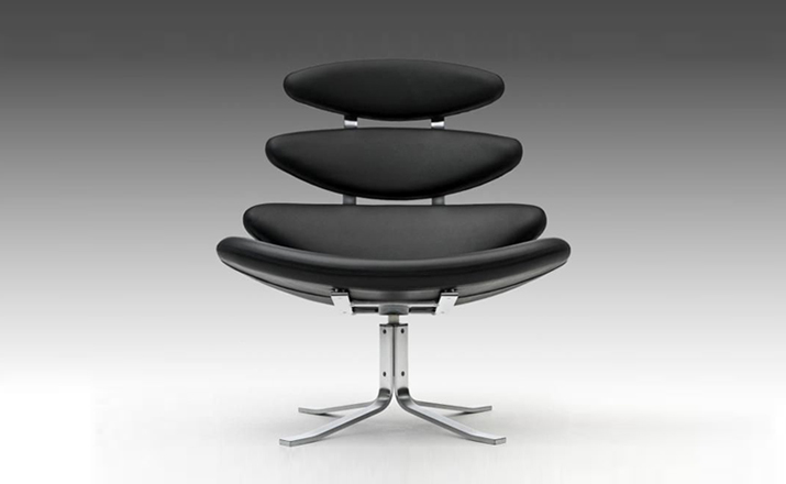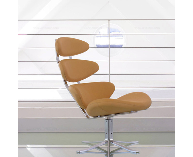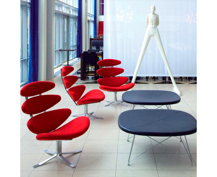 Poul M. Volther 于1964年的设计的王冠躺椅家具系列,是Poul M. Volther最知名的现代家具设计作品,此系列包括Corona Lounger Chair(王冠躺椅)、Corona Lounger Ottoman (王冠休闲脚踏)及其组合Corona Lounger Chair and Ottoman(王冠躺椅&脚踏)。历经40余年的今天,其作品在纷繁现代家具设计中仍占有一席之地。椅子充满了雕塑感,斯堪德维亚风格的简洁外形和舒适的坐感都是这张椅子成为创世之作的原因,四个椭圆形组成一张独特的椅子,无论摆放在哪,都令人过目不忘。此系列家具采用高强度钢材制作,表面电镀处理,外面为真皮或布艺制作,可360度旋转,不可后仰。适用范围广,酒店、会所、高档餐厅、夜总会、别墅等。