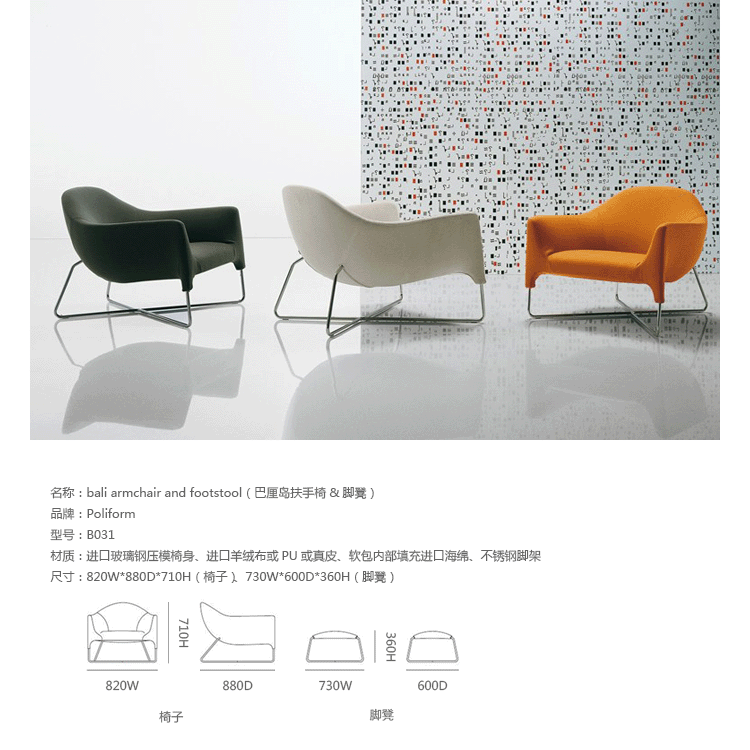 Bali Armchair(巴厘岛扶手椅)系列家具由著名华体会体育官方在线官网Carlo Colombo为Poliform所设计,包括扶手椅和脚踏。该系列家具根据最新的美学设计提供松弛的居坐度。制作采用光滑的不锈钢金属框架,进口玻璃钢压模椅身,高级羊绒布或PU或真皮、软包内部填充进口海绵,提供了绝佳的舒适度,是模块化及功能化的有机结合,提供多功能性的使用方式,与任何家具配合度都非常高。