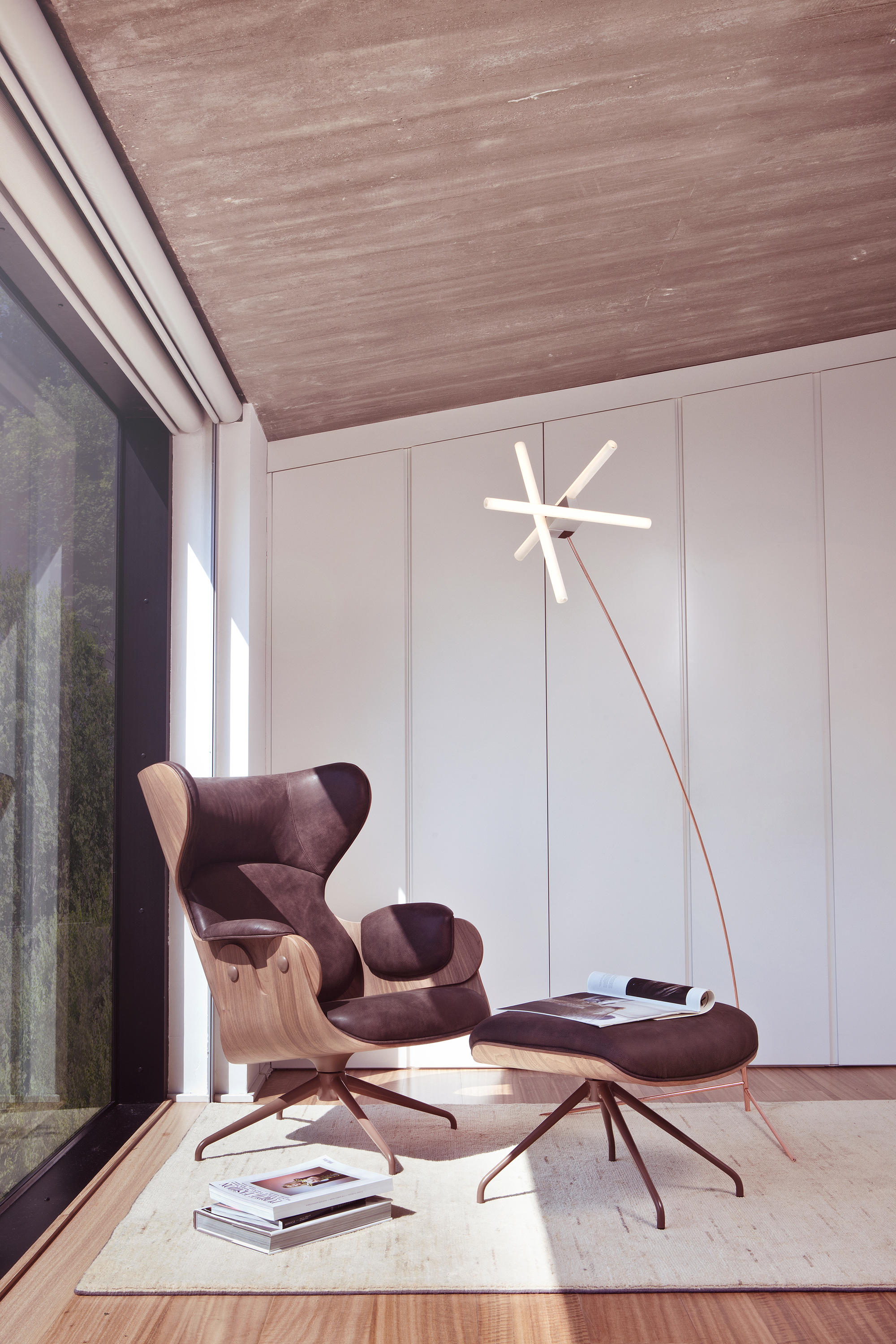 西班牙设计顽童 Jaime Hayon 2010 年在米兰家具展上再次吸引所有人的目光,Jaine Hayon 与西班牙家具厂牌 BD Barcelona Design 合作的 Showtime 系列家具自推出后俨然成为Jaime Hayon 个人的经典代表作,在 2010 年加入了新成员 Showtime Lounger 休闲椅,当中似乎不难发现有着 Charles & Ray Eames Lounge Chair and Ottoman 的影子,重新诠释这张20世纪经典椅款 Hayon 对设计大师致敬的同时,也注入更多 Hayon 幽默诙谐的设计手法。 Showtime 系列家具主要使用的材质和构造包括:优质夹板压模贴木皮而成、进口头层牛皮或进口羊绒布、内部填充高密度海棉、优质铝合金脚架。