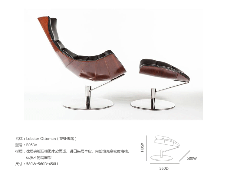 丹麦著名华体会体育官方在线官网Oluf Lund & Eva Paarmann设计的这款龙虾系列包含,Lobster Chair(龙虾椅)、Lobster Ottoman(龙虾脚踏)及组合搭配Lobster Chair and Ottoman(龙虾椅&脚踏)。此款椅子造型就像一只龙虾,采用优质夹板压模贴木皮而成、进口头层牛皮、内部填充高密度海棉、优质不锈钢脚架制成,简约立体的流线融入符合人体工学及空气动力学的结构设计,摆脱传统办公椅单调冷硬的刻板印象,达到舒适久坐的基本需求。