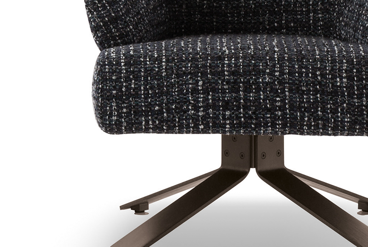 Creed “Lounge”沙发后方的地面支撑采用做工考究的弯曲金属架并搭配浅铜色亮光漆,前方支撑腿则为米灰色的鲍迪豆实木材质。支撑腿的上下方均采用精致的金属部件并搭配浅铜色亮面漆,用与众不同的细节设计来展现非同寻常的高超工艺。
