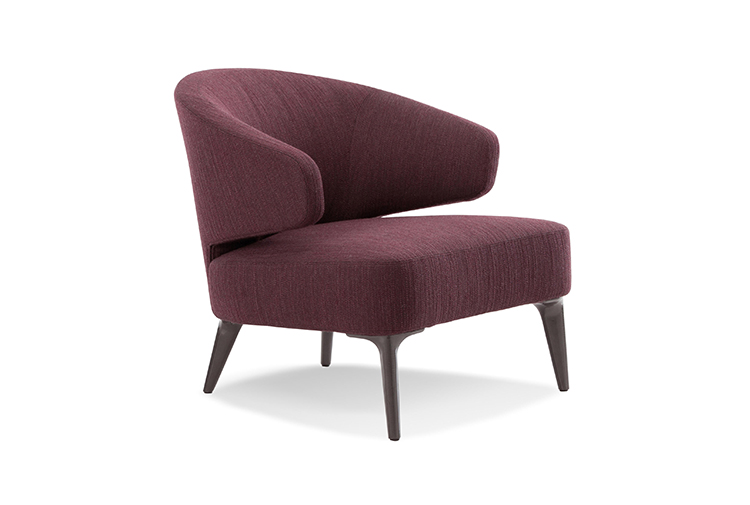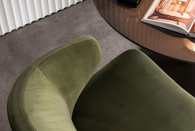 沙发的围裹式靠背特色十足,扶手线条与之完美呼应,以蓝灰色调呈现的压铸铝合金支脚尽展精致设计之美。