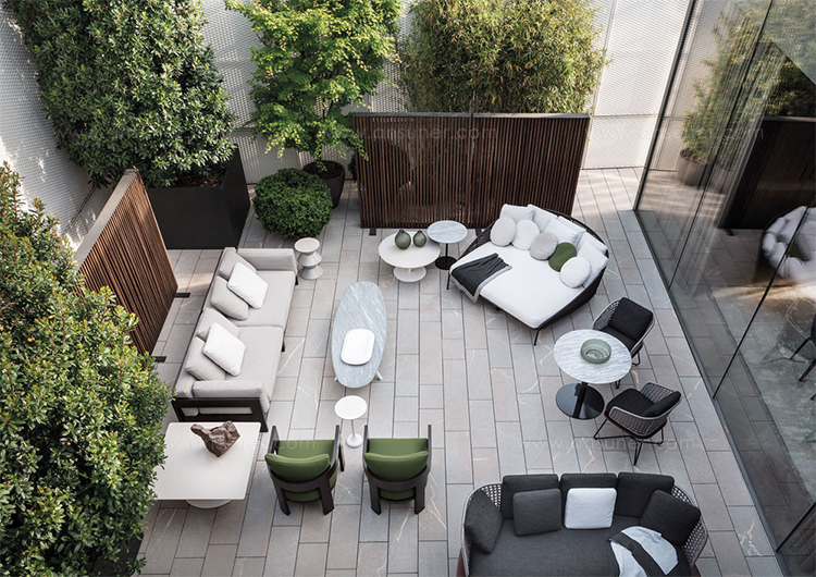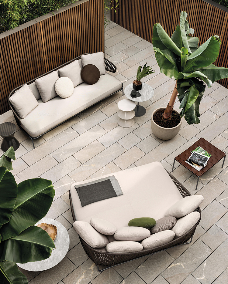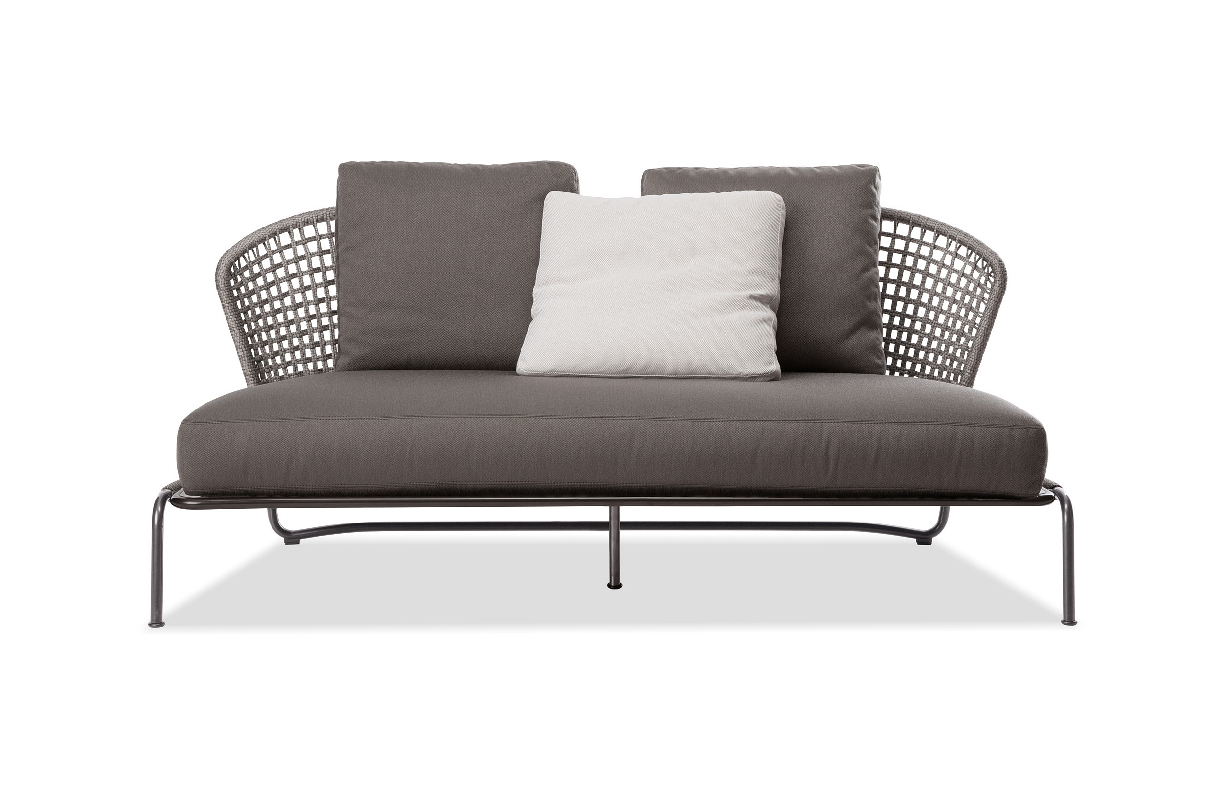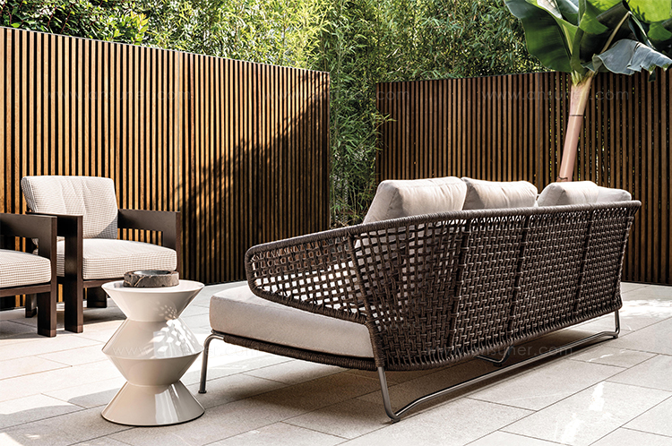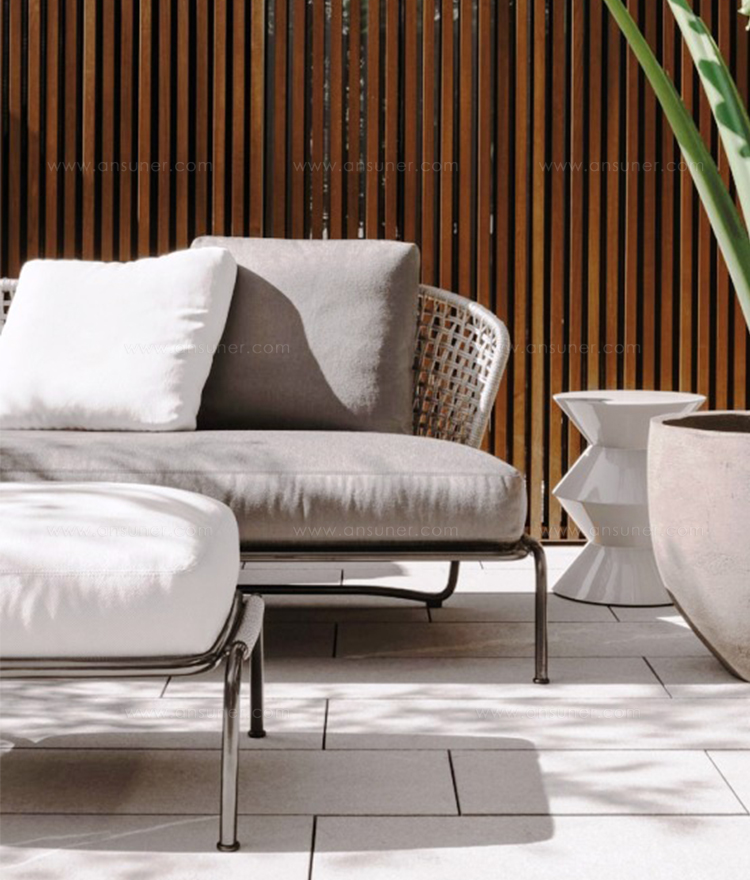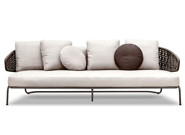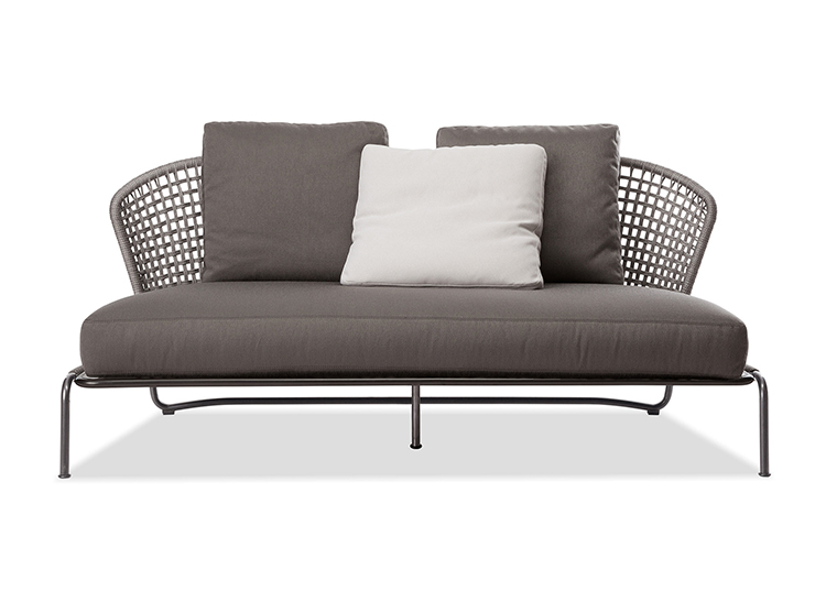 Aston是一个单品家族系列,其中包括沙发、沙发床、扶手椅、脚凳、座椅,为家居环境和“共享空间”提供优雅而时尚的装饰,在室内和室外皆可应对自如。阿斯顿“绳”户外系列采用金属材质的构架,搭配Pewter色聚酯漆面,部件都针对户外环境而经过特别处理,覆面采用疏水性纤维面料。靠背采用直径为7毫米的特殊聚丙烯纱线编织而成,两种颜色可供选择:浅灰色和深棕色,与全新Art Lifescape 02系列的面料和Alison “Dark Brown”户外系列的色调相得益彰。针对户外环境的特点,金属构架经过特别处理,搭配Pewter色聚酯漆面,覆面采用特殊聚丙烯纱线编织而成,有两种颜色可供选择:浅灰色和深棕色。坐垫采用Minotti Studio独家设计并通过激光加工而成的几何装饰。靠垫的内部填充物是高弹性聚氨酯泡沫,覆面采用疏水性纤维面料。