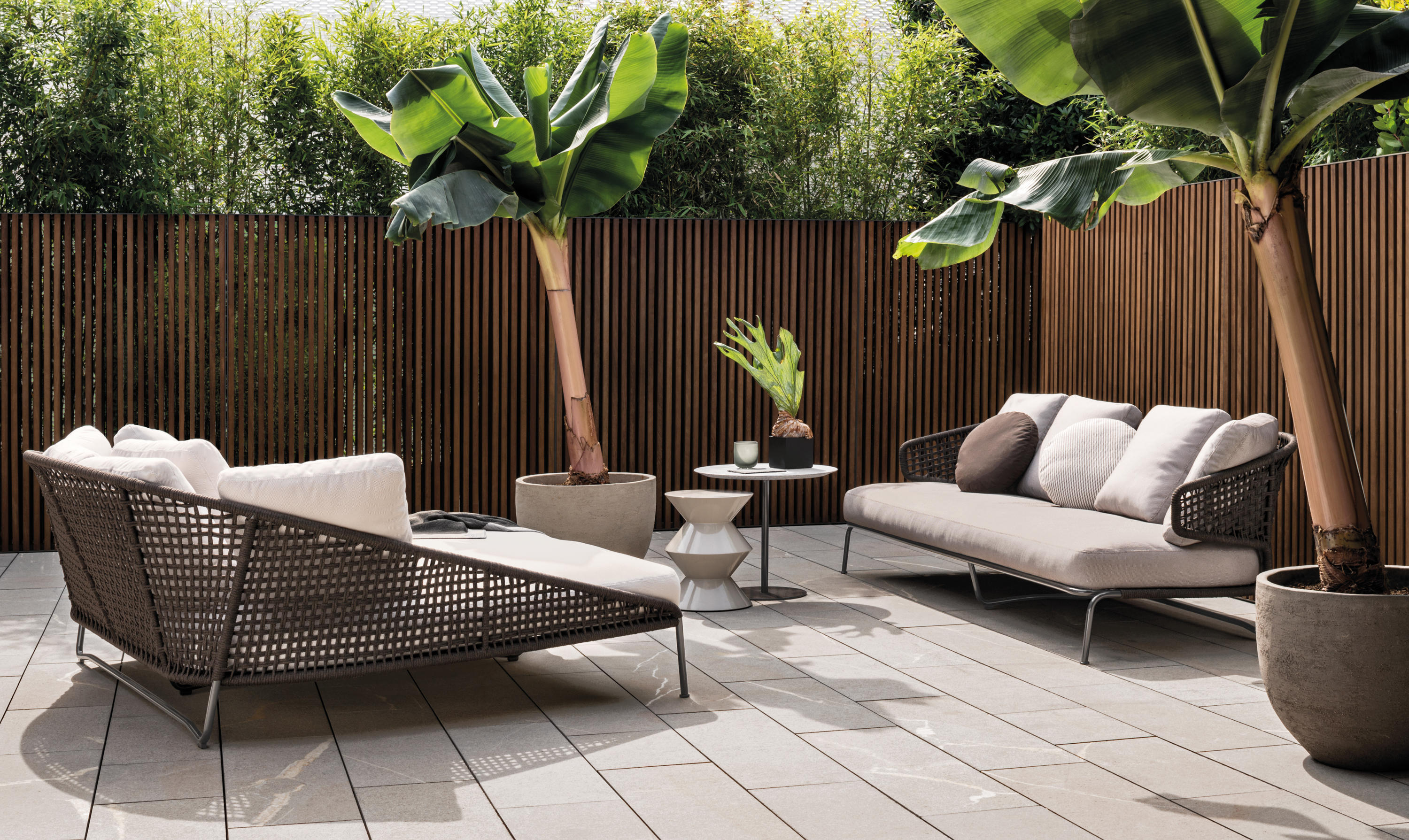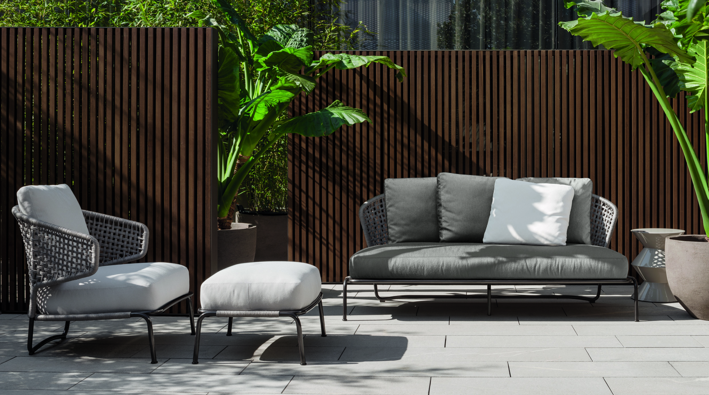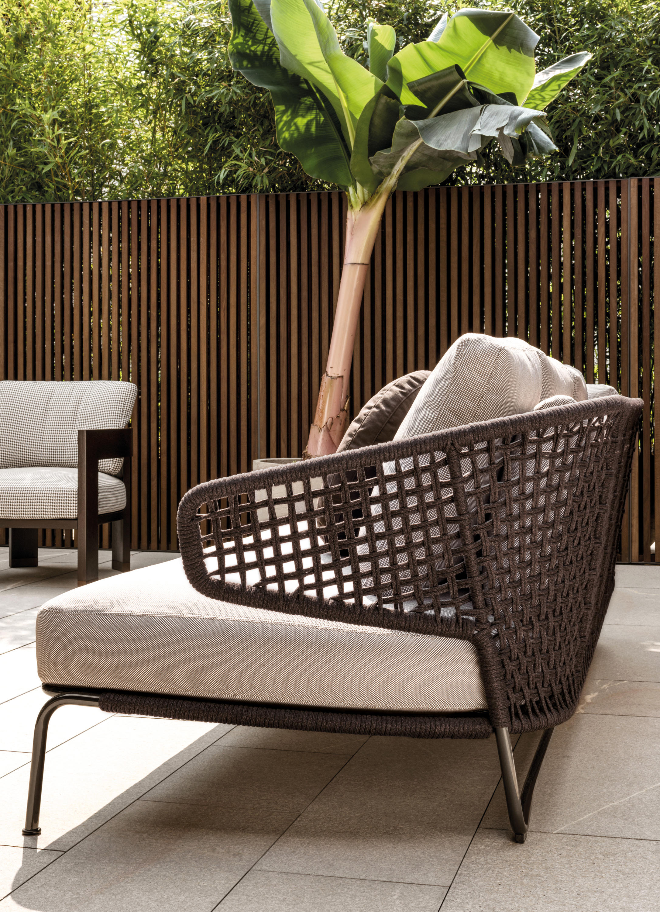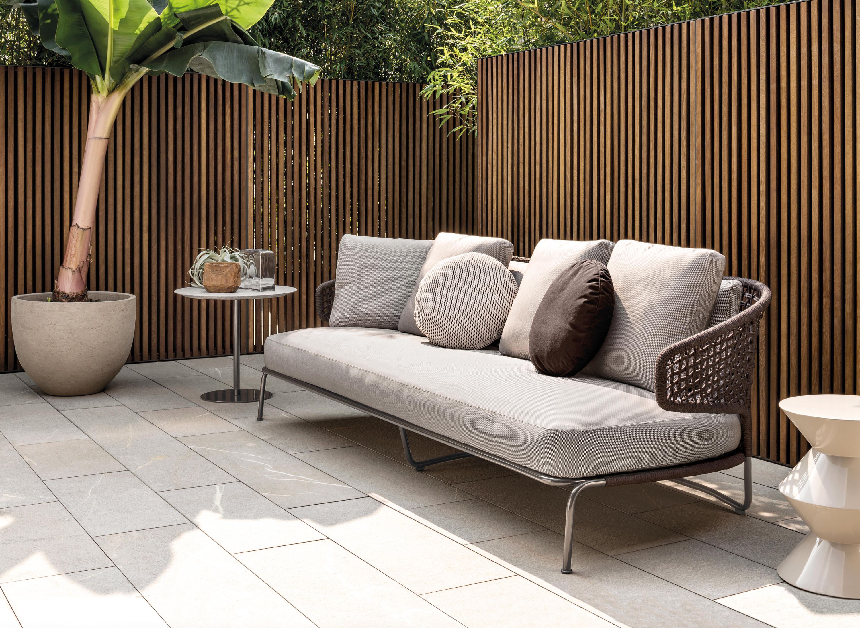 Aston是一个单品家族系列,其中包括沙发、沙发床、扶手椅、脚凳、座椅,为家居环境和“共享空间”提供优雅而时尚的装饰,在室内和室外皆可应对自如。阿斯顿“绳”户外系列采用金属材质的构架,搭配Pewter色聚酯漆面,部件都针对户外环境而经过特别处理,覆面采用疏水性纤维面料。靠背采用直径为7毫米的特殊聚丙烯纱线编织而成,两种颜色可供选择:浅灰色和深棕色,与全新Art Lifescape 02系列的面料和Alison “Dark Brown”户外系列的色调相得益彰。针对户外环境的特点,金属构架经过特别处理,搭配Pewter色聚酯漆面,覆面采用特殊聚丙烯纱线编织而成,有两种颜色可供选择:浅灰色和深棕色。坐垫采用Minotti Studio独家设计并通过激光加工而成的几何装饰。靠垫的内部填充物是高弹性聚氨酯泡沫,覆面采用疏水性纤维面料。
