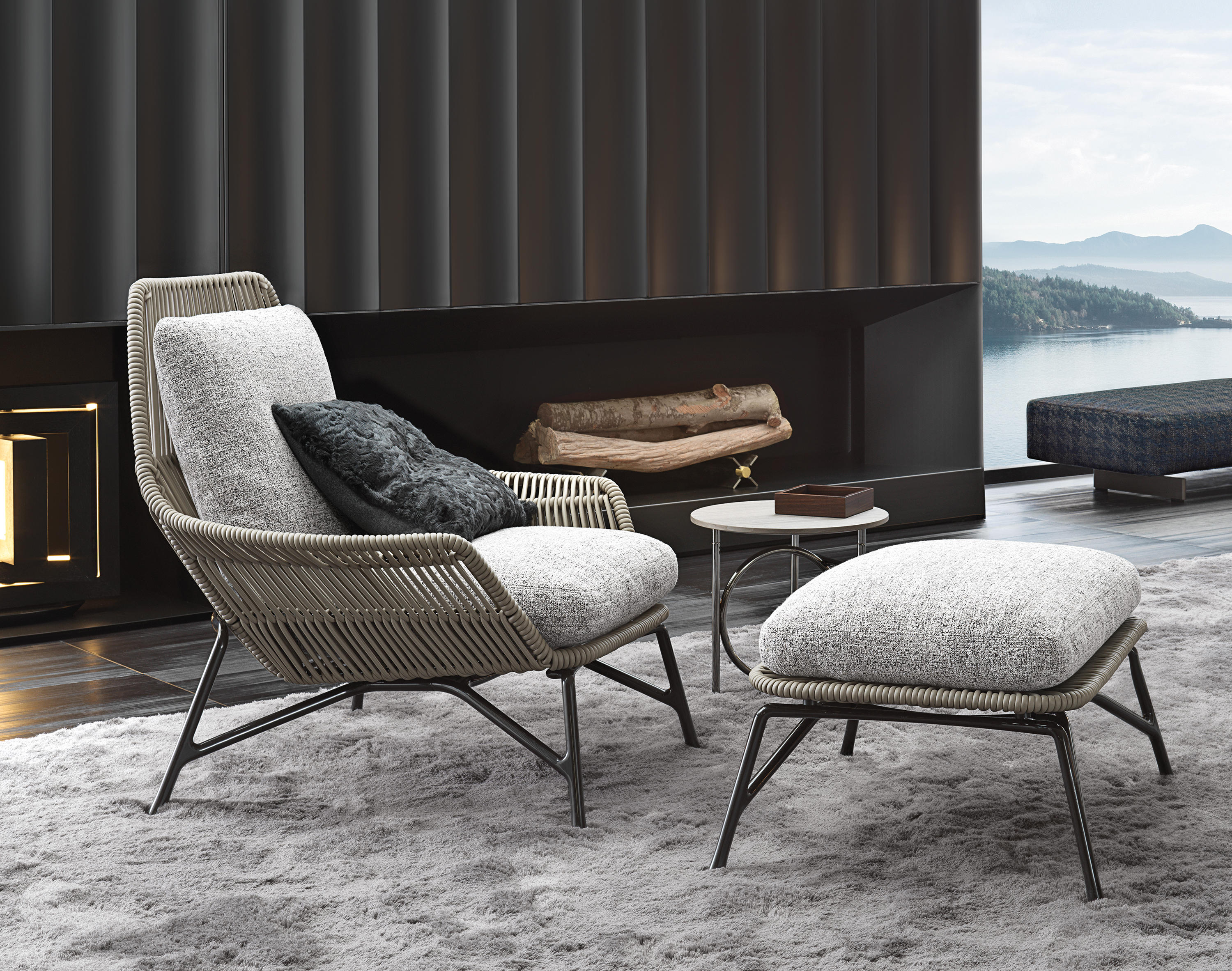 除去了2012年原版的填充物后,王子的“绳索”在室内展示了外壳的骨架,现在它的特点是由皮革覆盖的管状弦交织在一起。 设计灵感来自五十年代的美国现代主义,强调了锡色铝基通过复杂的压铸技术实现。扶手椅的柔软度由织物或皮革装饰的坐垫和靠垫突出。 米诺提产品的优势之一是对细节的剪裁讲究,这一点在圆形轮廓线的执行中得到了突出体现。圆形轮廓线的特点是贯穿整个皮革长度的独特接缝。王子的“绳索”室内有四种颜色——鸽灰色、灰色、烟草和深棕色——扶手椅可以有一个脚凳,上面有相同的风格标志。