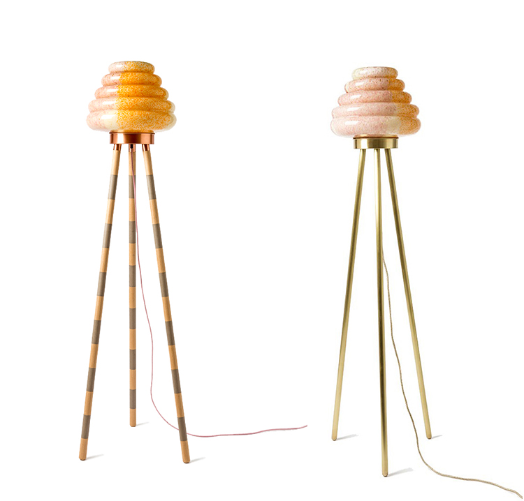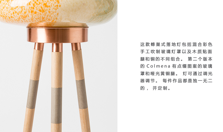 这款蜂巢式落地灯包括混合彩色手工吹制玻璃灯罩以及木质贴面腿和铜的不同组合。 第二个版本的Colmena有点缀图案的玻璃罩和哑光黄铜腿。 灯可通过调光器调节。 每件作品都是独一无二的,并定制。