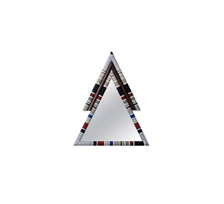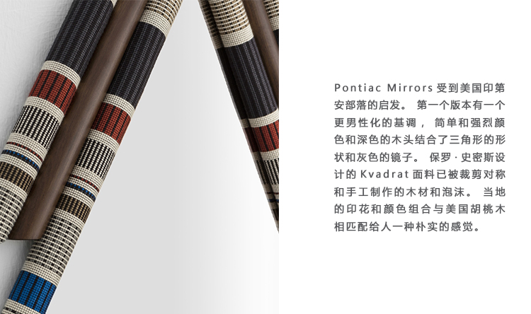 Pontiac(庞蒂亚克)镜受到美国印第安部落的启发。第一个版本有一个更男性化的基调,简单和强烈颜色和深色的木头结合了三角形的形状和灰色的镜子。保罗·史密斯设计的Kvadrat面料已被裁剪对称和手工制作的木材和泡沫。当地的印花和颜色组合与美国胡桃木相匹配