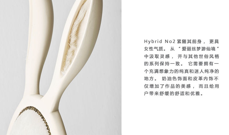 Hybrid No2紧随其前身,更具女性气质。 从“爱丽丝梦游仙境”中汲取灵感,并与其他世俗风格的系列保持一致。 它需要拥有一个充满想象力的纯真和迷人纯净的地方。 奶油色饰面和皮革内饰不仅增加了作品的美感,而且给用户带来舒缓的舒适和优雅。