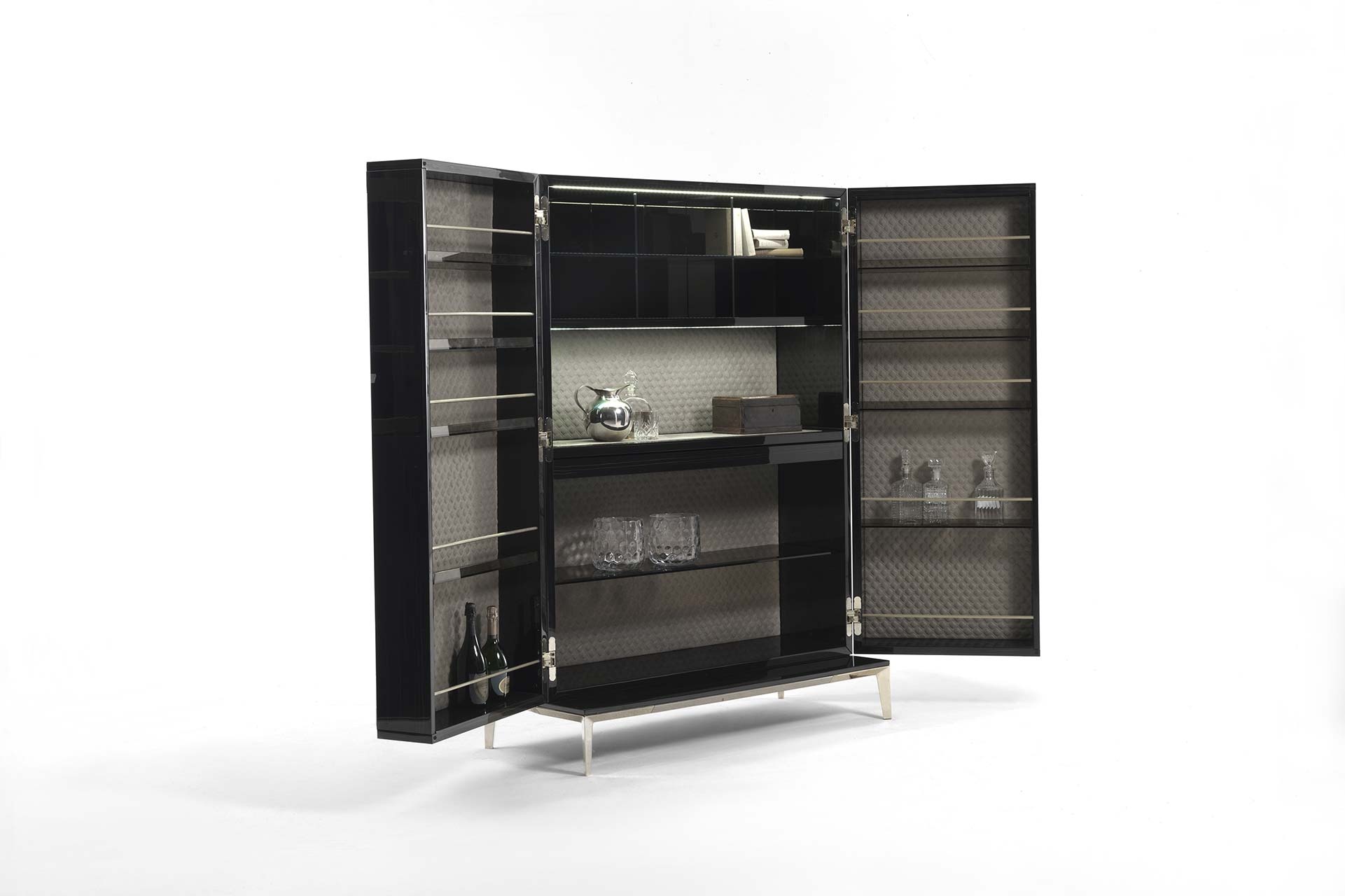 客厅集合项目的特点是精致的牛皮插入,几乎嵌在乌木